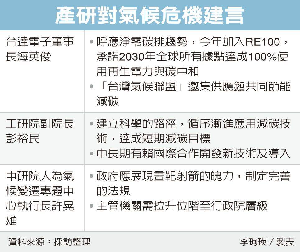 面對氣候危機嚴峻挑戰,台達電子董事長海英俊、工研院副院長彭裕民昨(20)日一致表示,唯有建立科學路徑,讓企業、人民都能循序漸進,應用現有的減碳技術,2030年有機會達成減碳30%目標。
