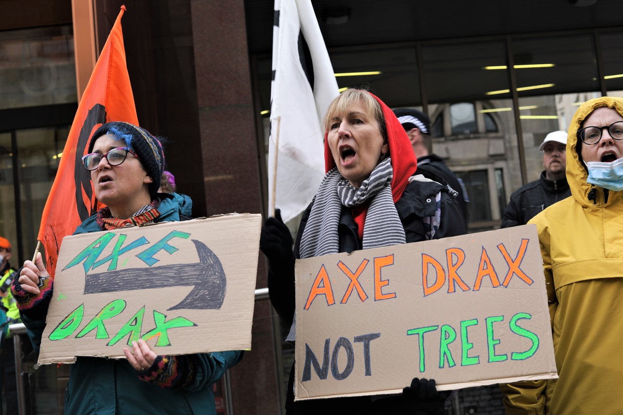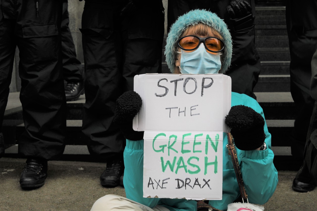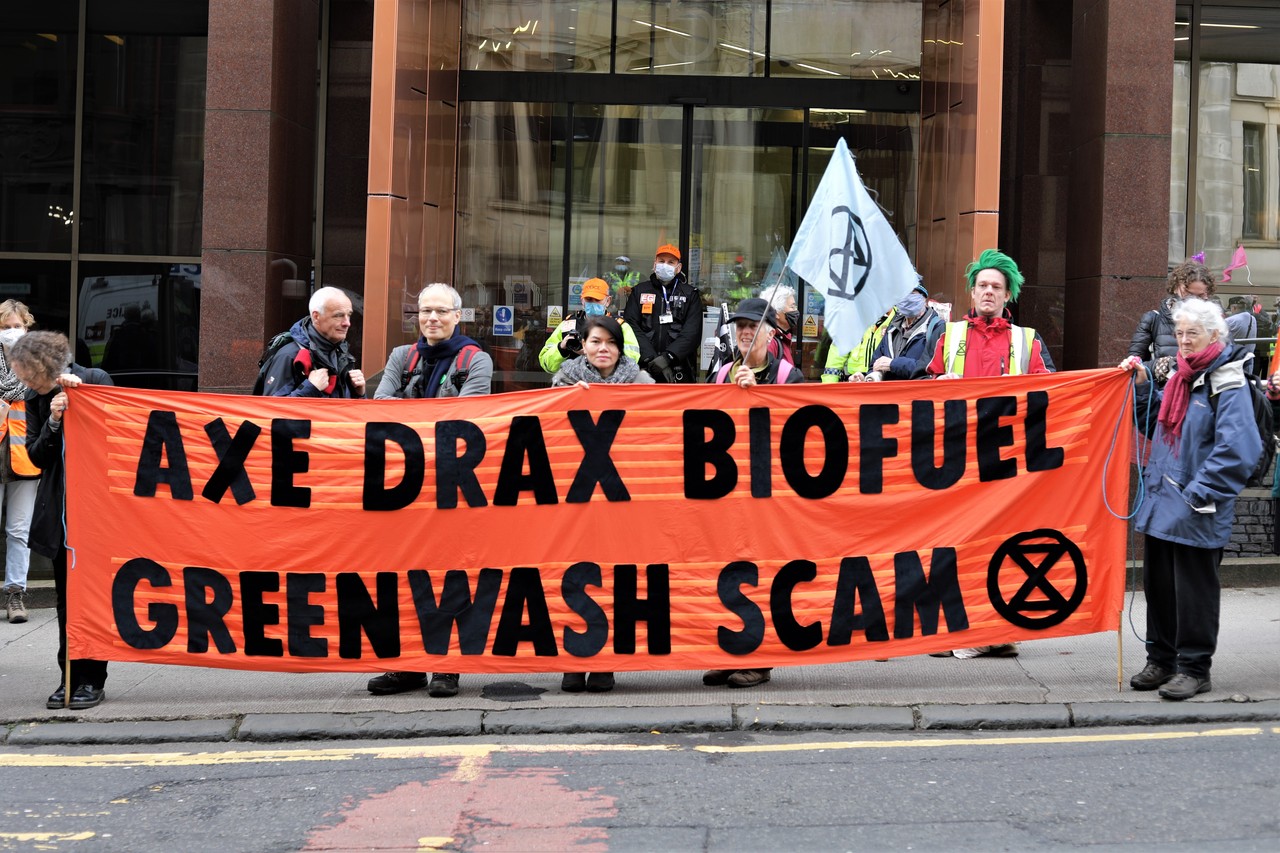 抗議人士在市中心的文森街,拉起寫著「漂綠騙局」(Greenwash Scam)的布條,抗議英國的Drax電廠,藉由發展生質能發電和碳捕捉技術來「漂綠」,藉此拒絕關閉電廠與減少碳排。一名蘇格蘭抗議人士珍妮表示:「我們不能讓再生能源,成為大型企業繼續牟利的手段」。