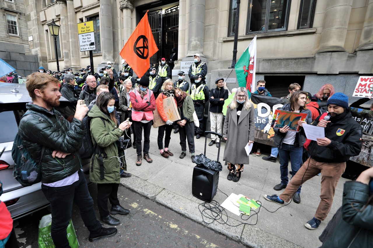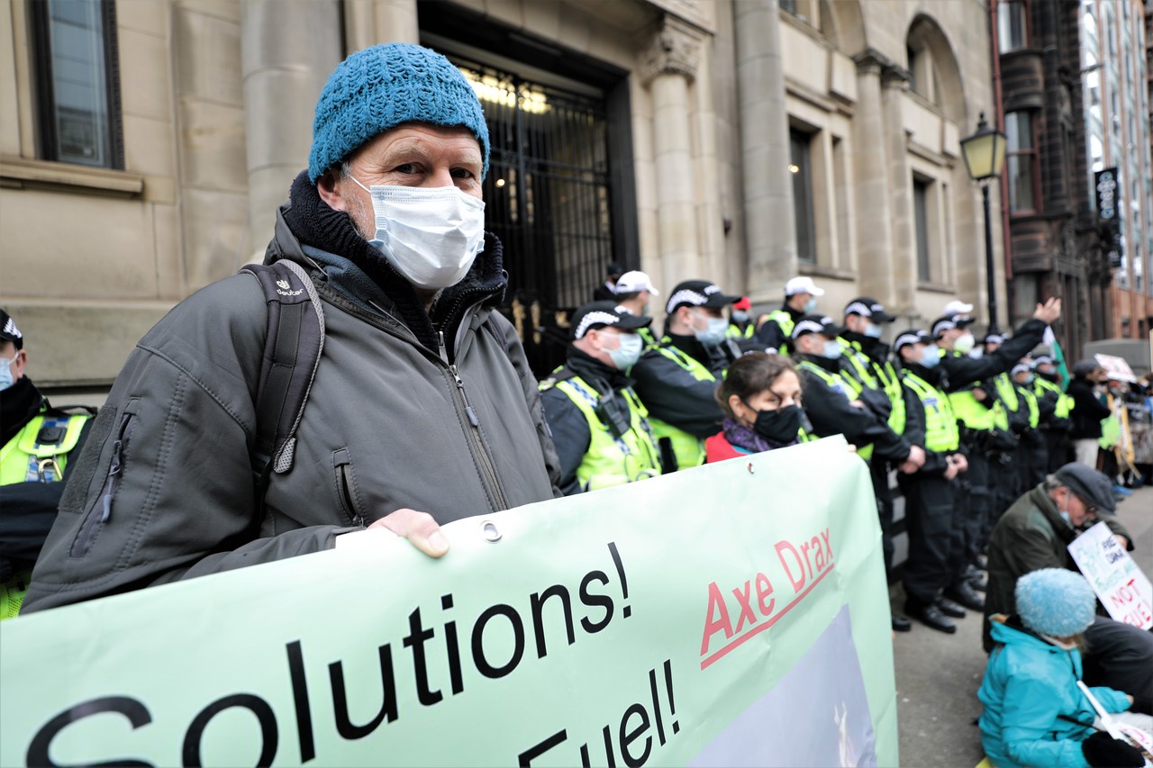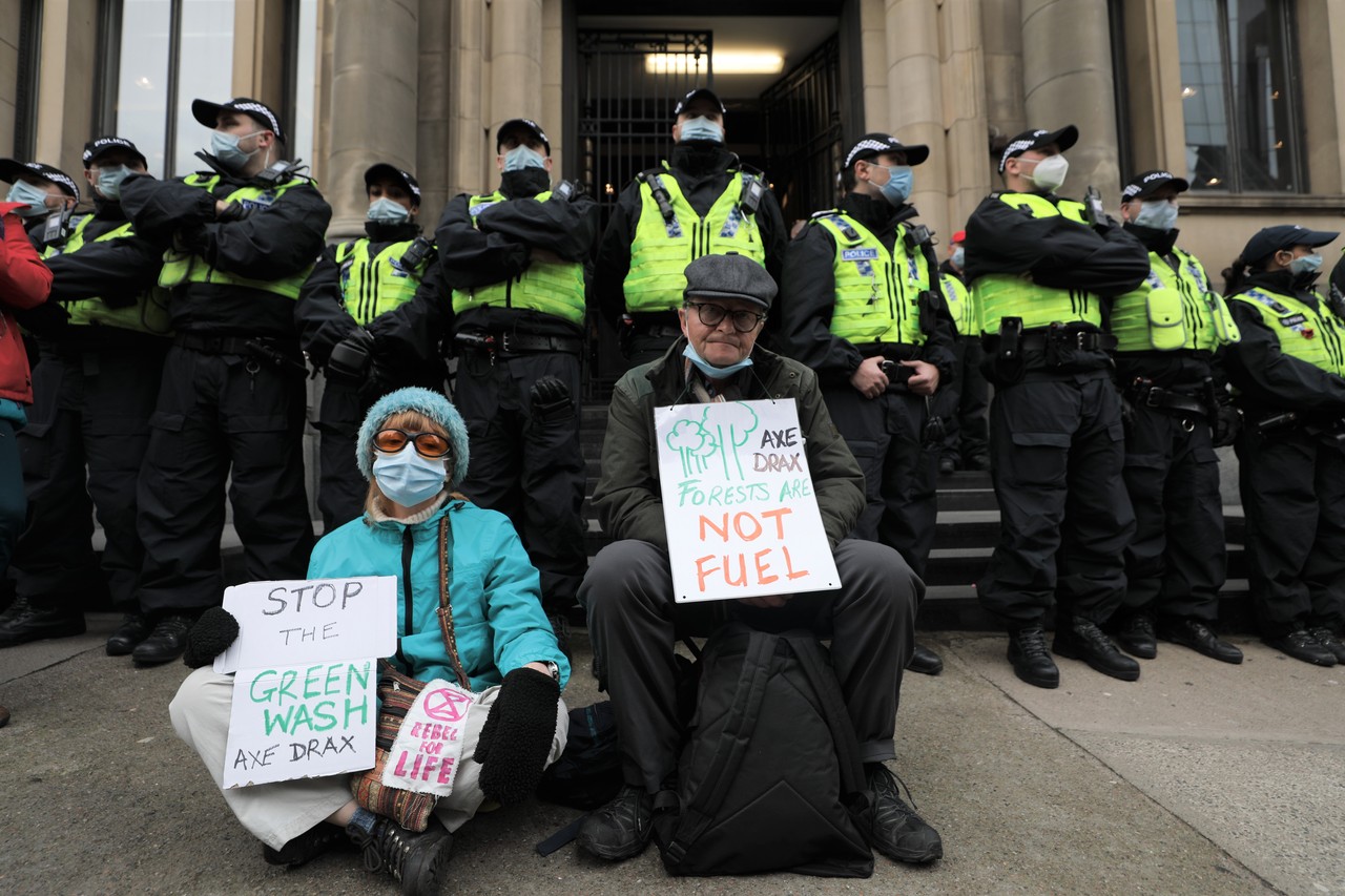 抗議人士在市中心的文森街,拉起寫著「漂綠騙局」(Greenwash Scam)的布條,抗議英國的Drax電廠,藉由發展生質能發電和碳捕捉技術來「漂綠」,藉此拒絕關閉電廠與減少碳排。一名蘇格蘭抗議人士珍妮表示:「我們不能讓再生能源,成為大型企業繼續牟利的手段」。