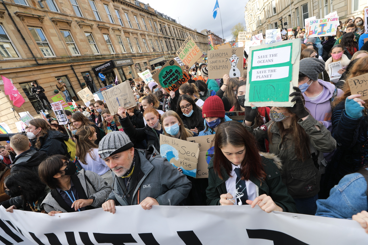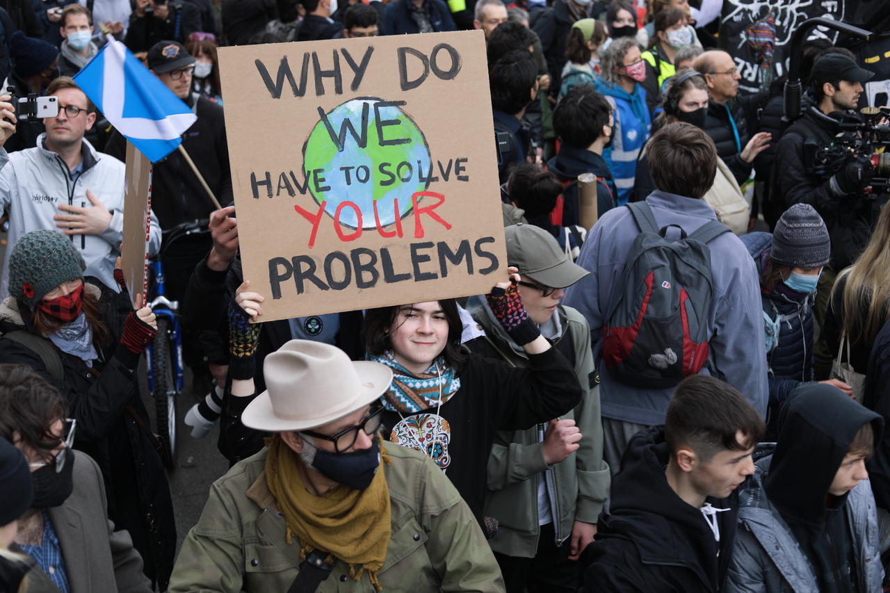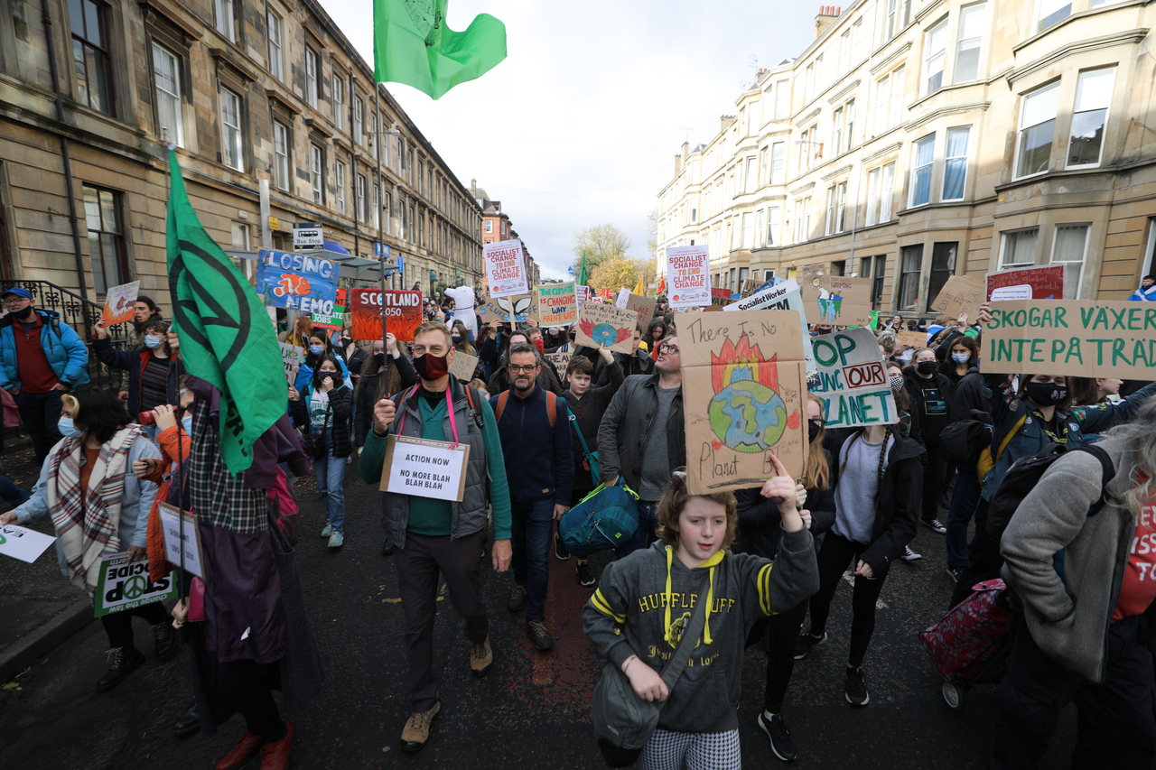 氣候大遊行正在蘇格蘭格拉斯哥舉行,環保人士與民眾全球領導人發出抗議。特派記者林奐成/攝影