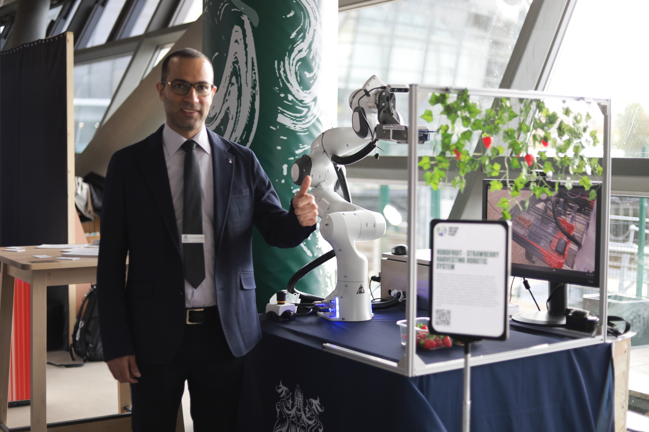 另一方面,英國林肯大學(University of Lincoln)農糧科技研究院也參與盛會,將他們研發的「採莓機器人」(Robofruit)展示在會場,非常吸睛。該研究所副教授阿米爾(Amir Ghalamzan)接受本報訪問時表示,這是全自動化的草莓摘採機器人系統,可以24小時運作,不僅加強效率,同時可以減少摘採過程中的食物浪費,並節省存放空間,有助農業減碳。