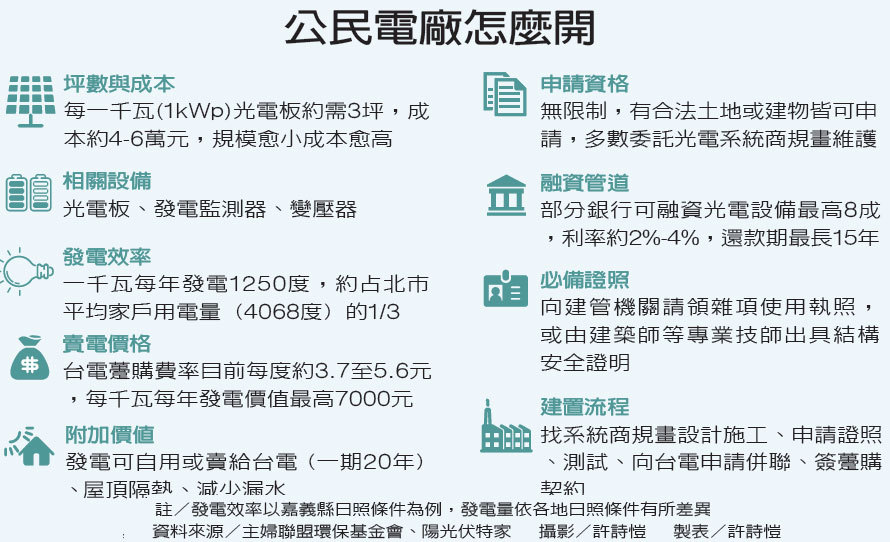 直到第五年,陽光伏特家才和主婦聯盟環保基金會合作,取得北市關渡國中的公民電廠案,此案採在地優先策略,六十三片光電板半數由市民出資、收益。陳惠萍說,廿年的發電收益還可支持關渡國中的能源教室,成為社區認識綠能發展的重要基地。