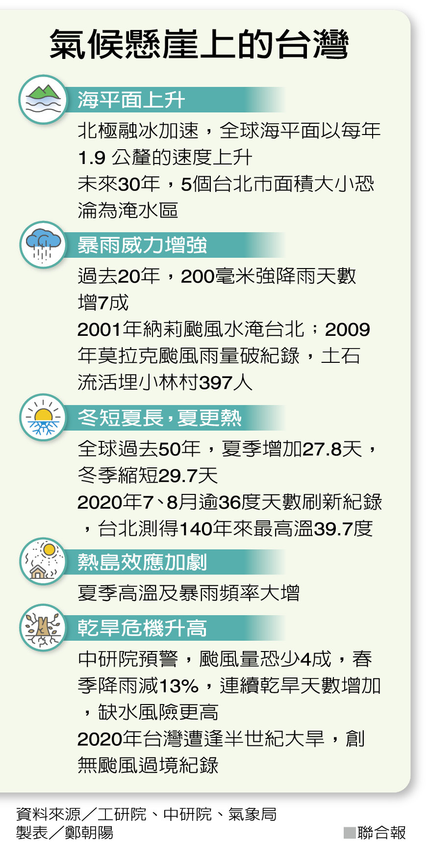 「暖化、氣候變遷的影響太多了」,中研院人為氣候變遷專題中心執行長許晃雄說,森林有些樹種會消失,玉荷包恐要北漂往中台灣種,甜柿也要往更高海拔移民;未來台灣颱風數量可能減少四成,連續乾旱天數將增加,缺水風險更高,但這一切都缺乏政府長期且系統性支持的科學研究,以致只能講「可能」而非「一定」,對公衛、農漁業等衝擊和應變的調適方案就如瞎子摸象,今年台灣半世紀一遇的大旱即是如此。