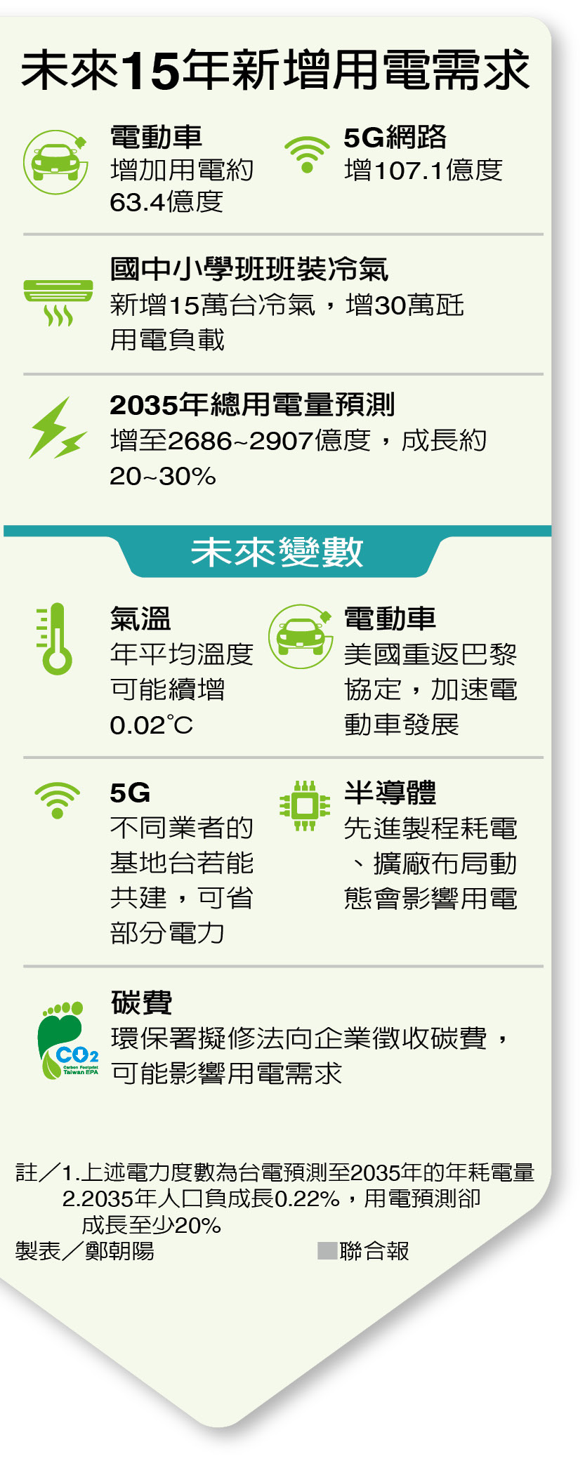 由於攸關未來是否缺電和電源開發不易等危機,台電評估的考慮因素不少,例如氣溫上升趨勢、美國重返巴黎協定後的氣候行動是否加速,以及半導體擴廠與先進製程的耗電量等。