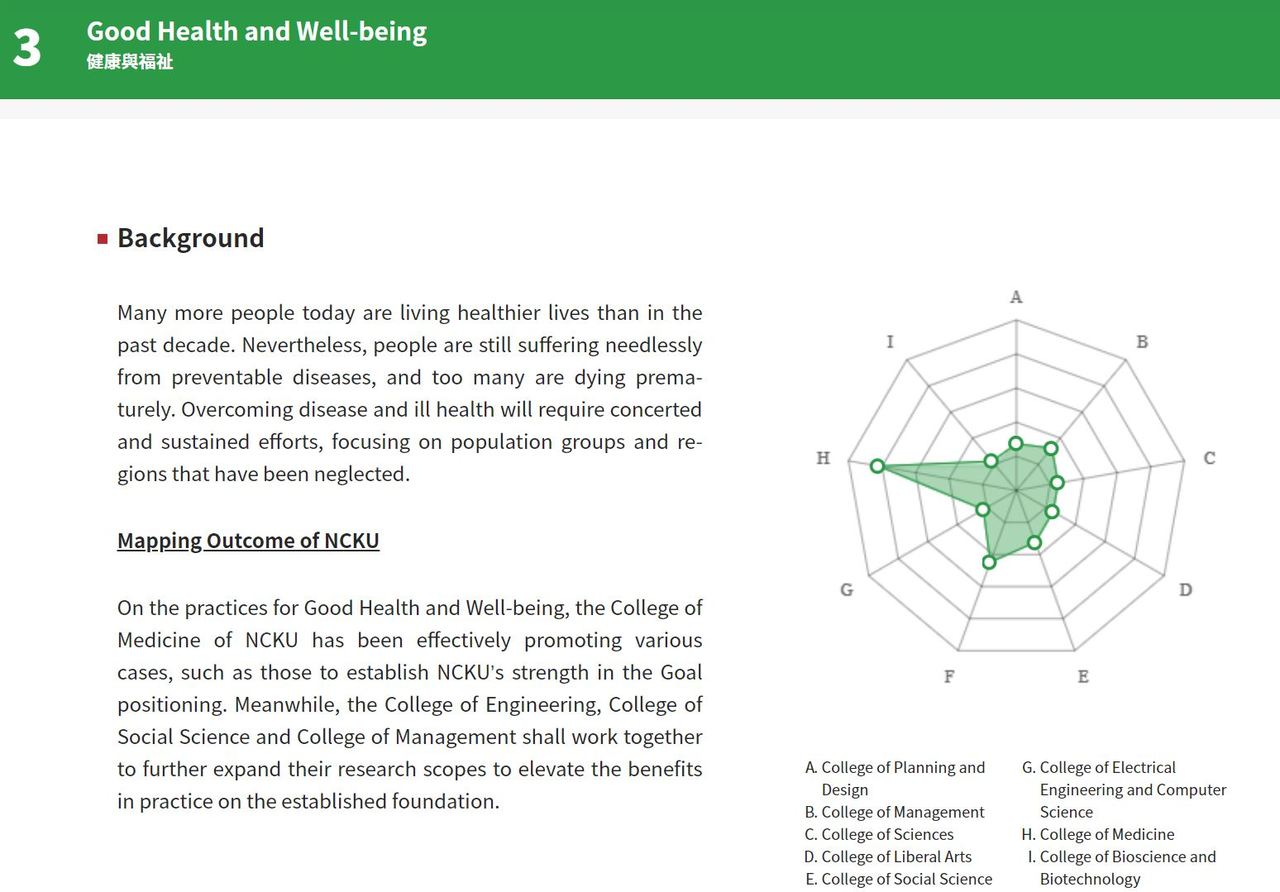 成功大學則架設「NCKU 2030」網頁,依序描述各學院對17項SDGs的貢獻。以第三項「健康與福祉」為例,目前仍有許多人遭受可預防疾病的折磨,成大醫學院一直在推廣各種案例,比如成大醫學中心研究團隊針對腸病毒致病機制、病毒學以及臨床處置進行系列研究,已成為世界上此領域的主要研究群。工程學院、社會科學學院和管理學院也將共同努力。