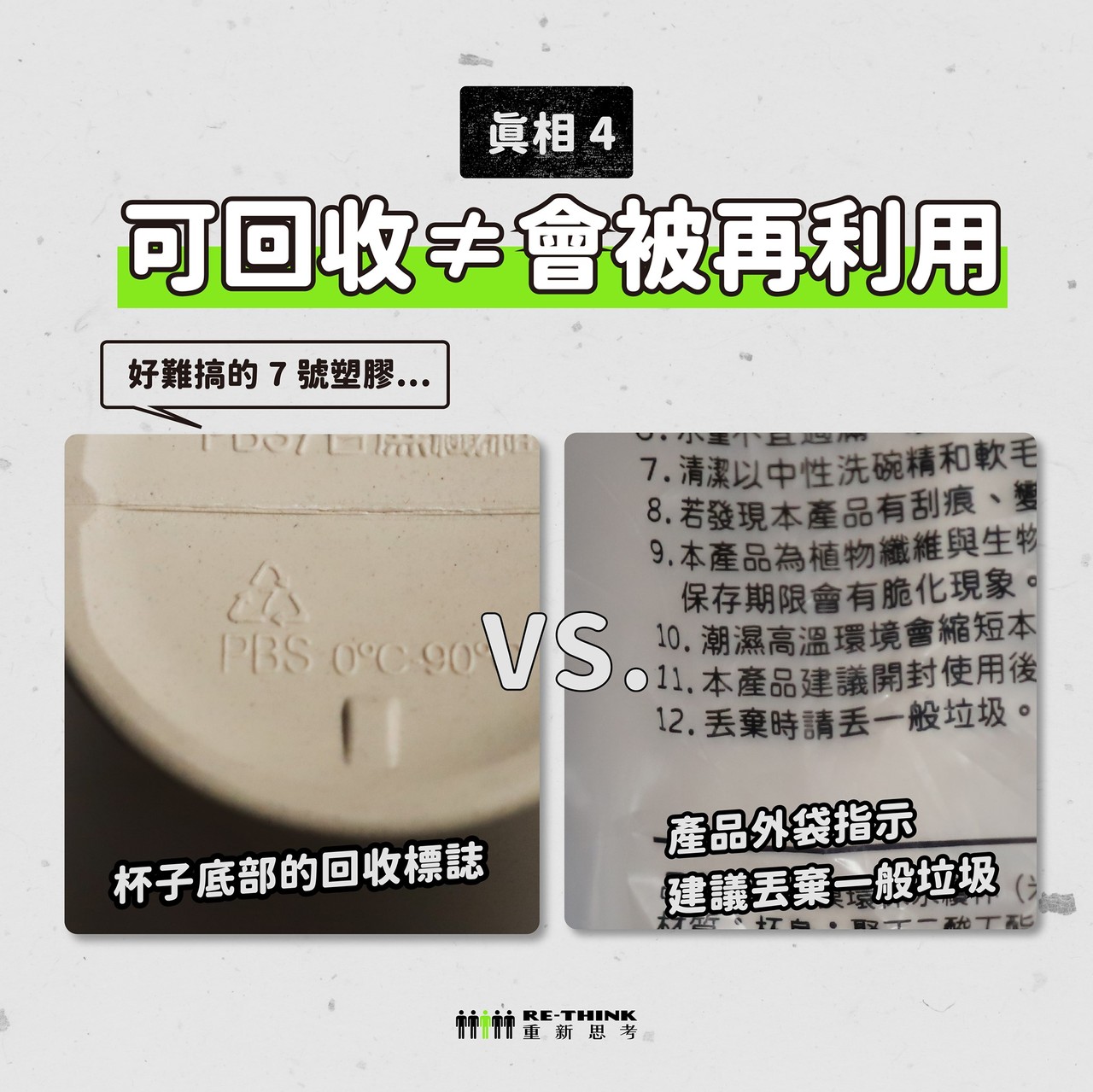 不過,這就是矛盾之處,7 號塑膠如 PLA、PBS 等材質,都是標準的「資源回收不利用」,它們最終的下場,就是被從回收桶中挑出來,燒毀。