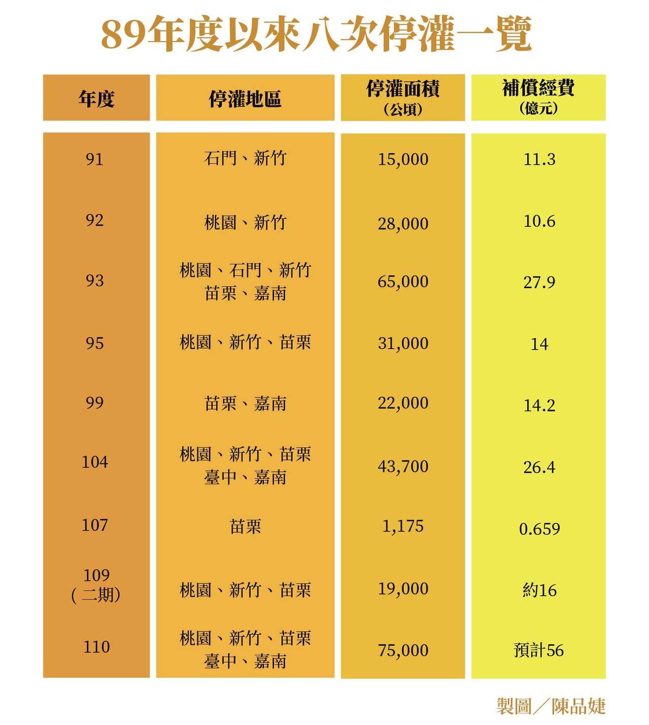 每每台灣出現旱象,政府皆以穩定「公共用水」為由,迫以停灌休耕,優先調用農業用水。下令停灌的農委會主委陳吉仲出身農家,任教數十年才轉入公職,也曾是台灣農村陣線一份子,七年前的他在政論節目說過:「水資源有限的時候怎麼做最有效使用,你不能每次遇到這樣的情形就犧牲農業」,如今這段話格外諷刺。