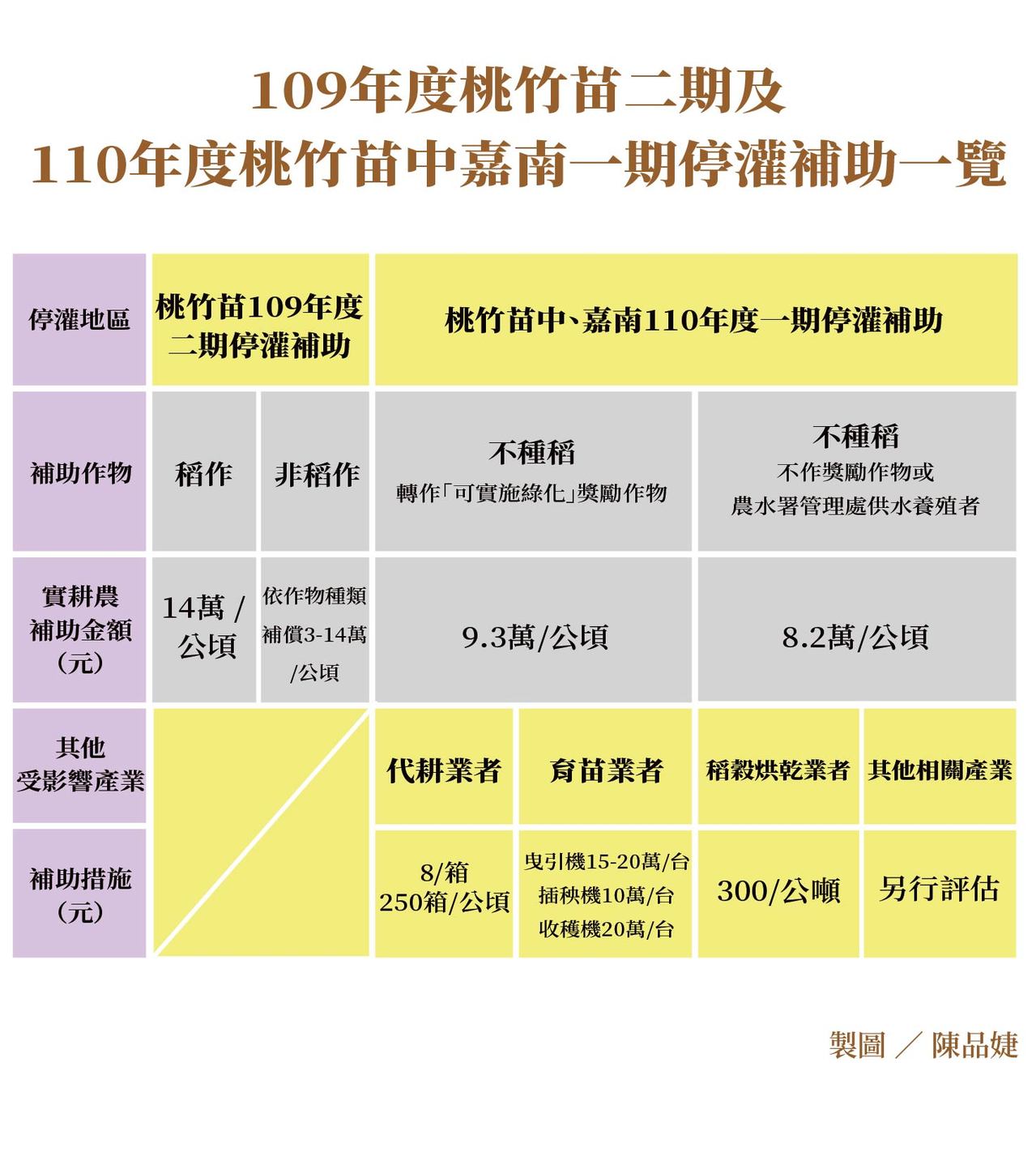 原先桃竹苗地區一公頃14萬的補償,包含稻農原先投入的耕作成本及預計收入;嘉南地區的補助最低是8萬2千元,理想狀態可讓農民負擔田地租金外,仍有存款撐過休耕期。停灌期間,農民可翻土、作綠肥,讓土地保持生產力,以利下一期耕作。如今,卻有農民恐面臨零收入、零補助的停灌休耕期,只能默默吃老本。