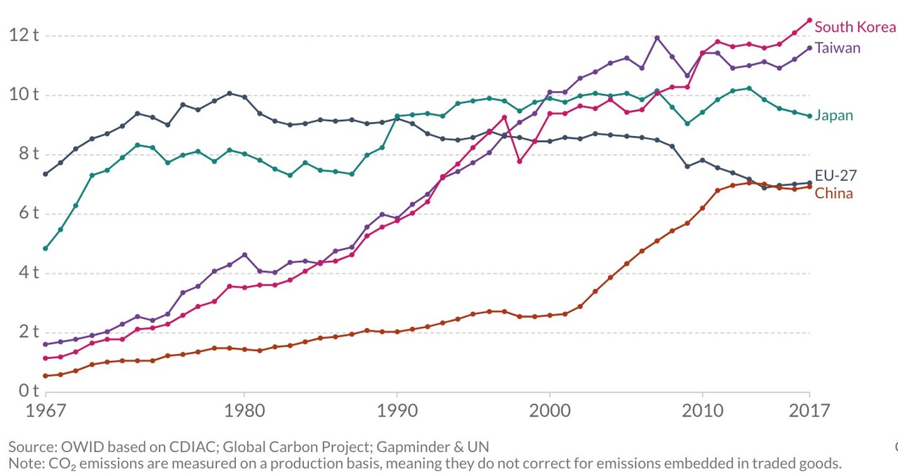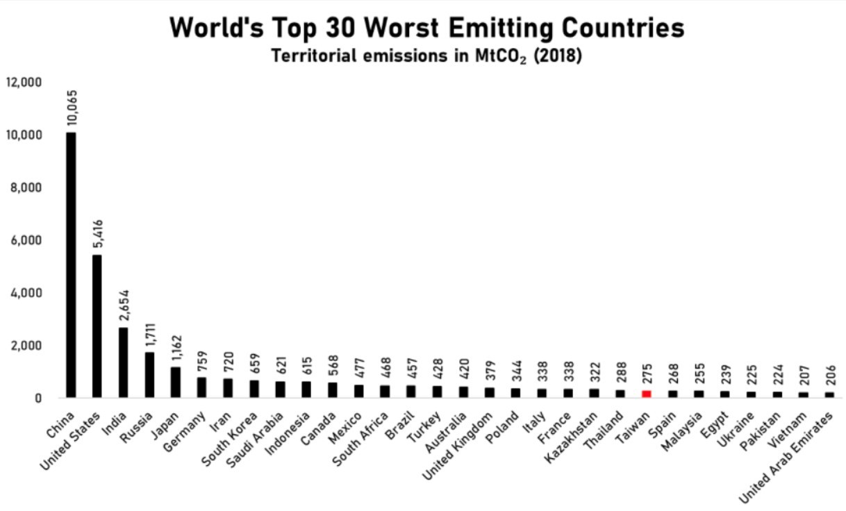 除此之外,台灣的人均碳排放量(carbon emissions per capita)從2000年開始已遠高於世界大部分已發展國家。舉例來說,台灣在2017年的人均碳排放量為11.62公噸,遠高於日本(9.32)、歐盟27國(7.05)和中國(6.92)。有鑒於如此高的碳排放量,台灣實在無法推卸自己減碳的責任。