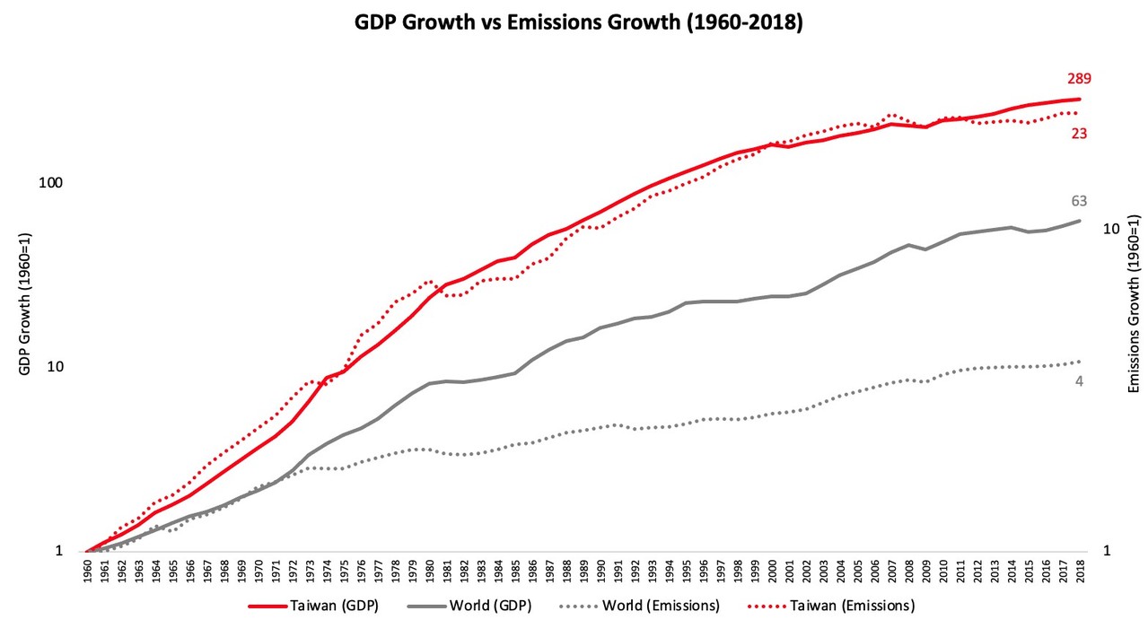 與世界平均碳排和GDP成長相比,台灣自1960年起,GDP成長與二氧化碳排放量呈現一同增漲的趨勢。