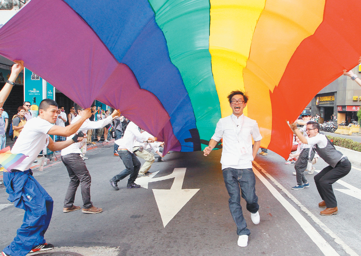 台灣同志遊行,象徵性愛、力量、希望、自然、自由和藝術的彩虹旗飄揚在隊伍中。