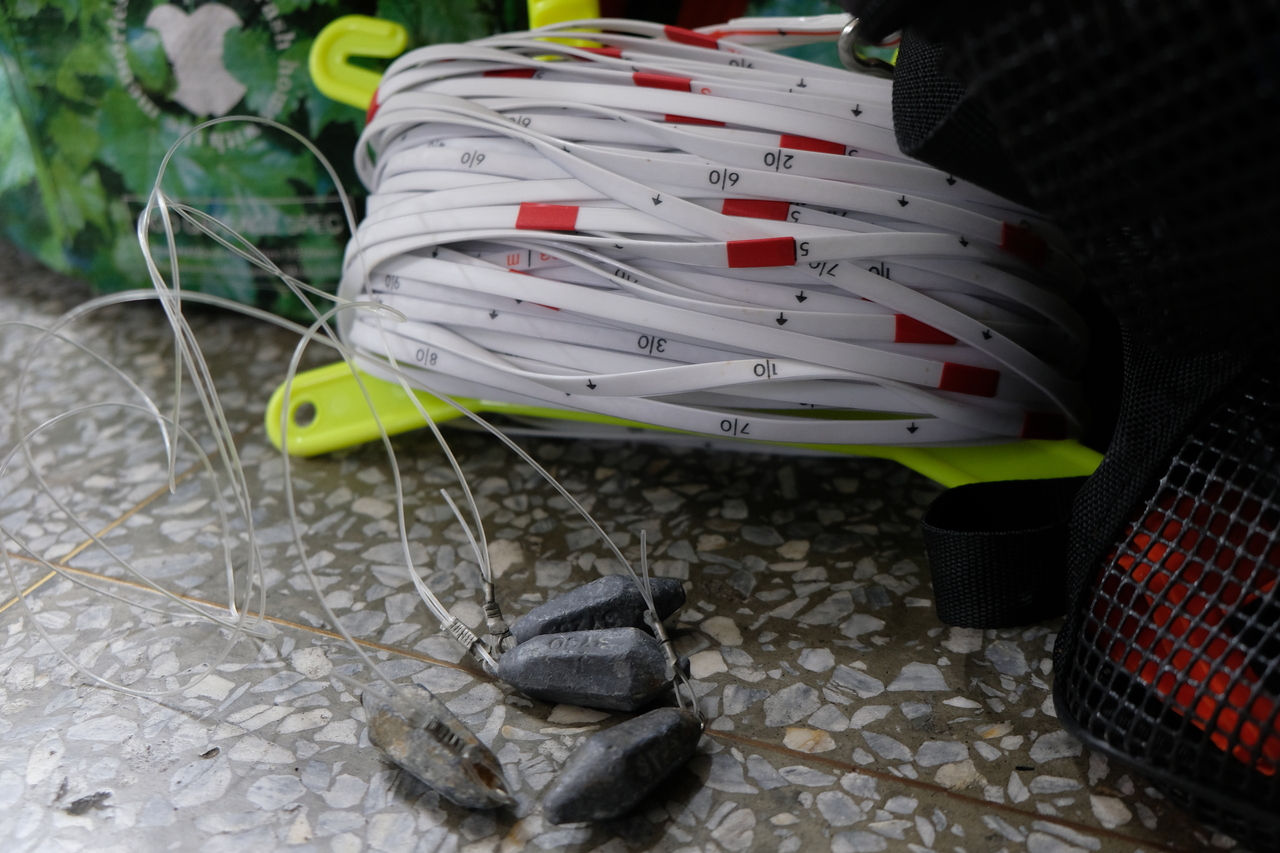 水下工作使用的水尺和用撿來的鉛粒做成的重錘。