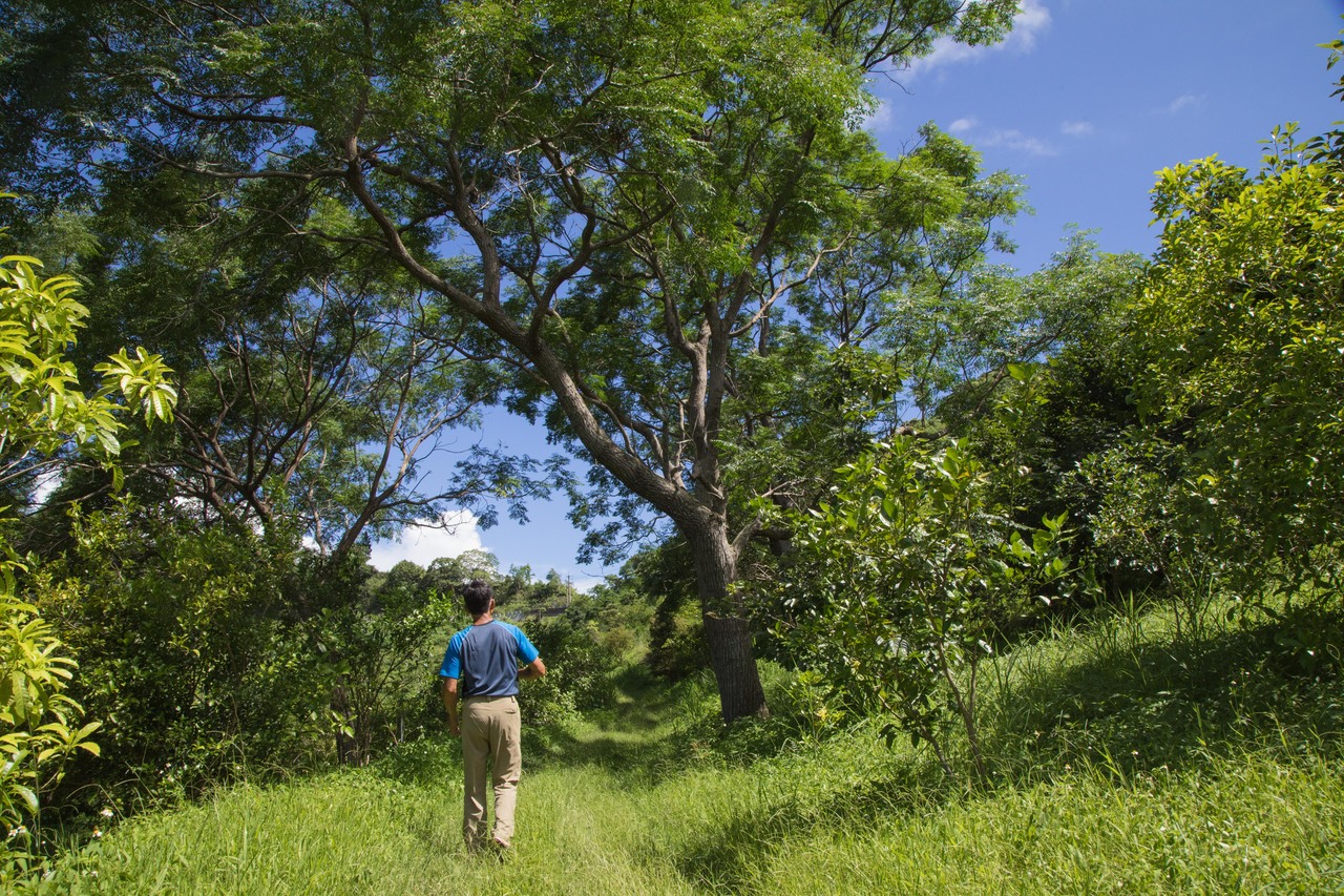 賴金田把農作物、樹木種成混生林,希望盡量減少人為因素,讓生態符合它應有的模樣,這條步道背後便栽種著水果。記者許詩愷/攝影
