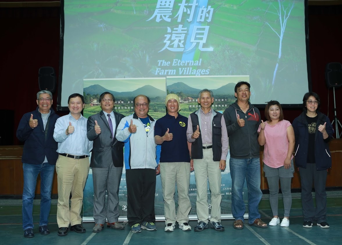 公視「農村的遠見」在池上舉辦特映會。左起導演劉嵩、水土保持局台東分局長王志輝、池上鄉長張堯城、池上鄉文化藝術協會理事長梁正賢、錄片主角吳家恩、蕭仁義、曾鵬璋、何明遠的夫人、公視經理於蓓華。
