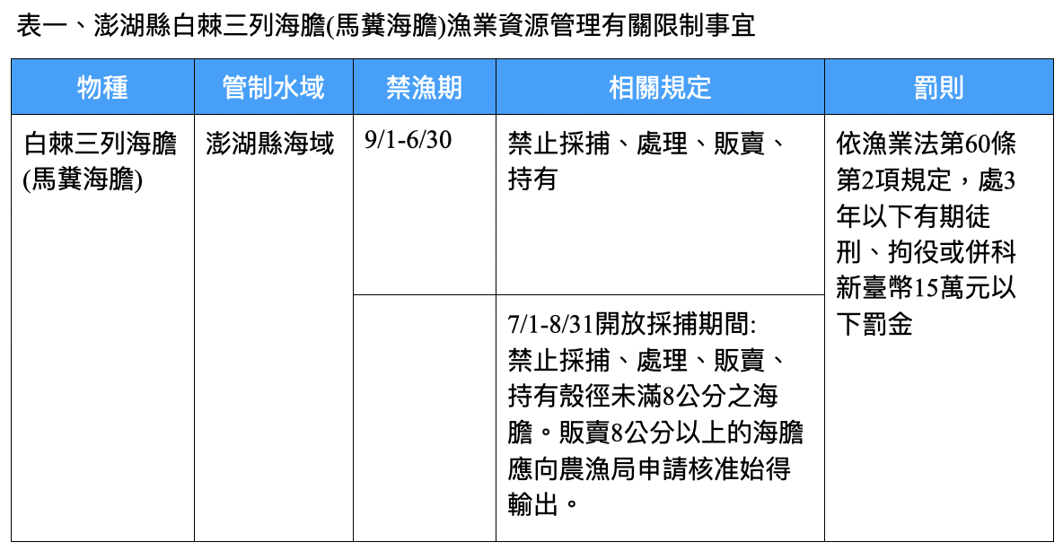 每年5月到9月是海膽性腺的發育成熟期,澎湖縣政府為了避免漁業資源浩劫,也於2007年開始管制馬糞海膽採捕;2018年因海膽持續銳減,原訂每年5/16-8/31為期四個月的採捕期,縮減至兩個月7/1-8/31。