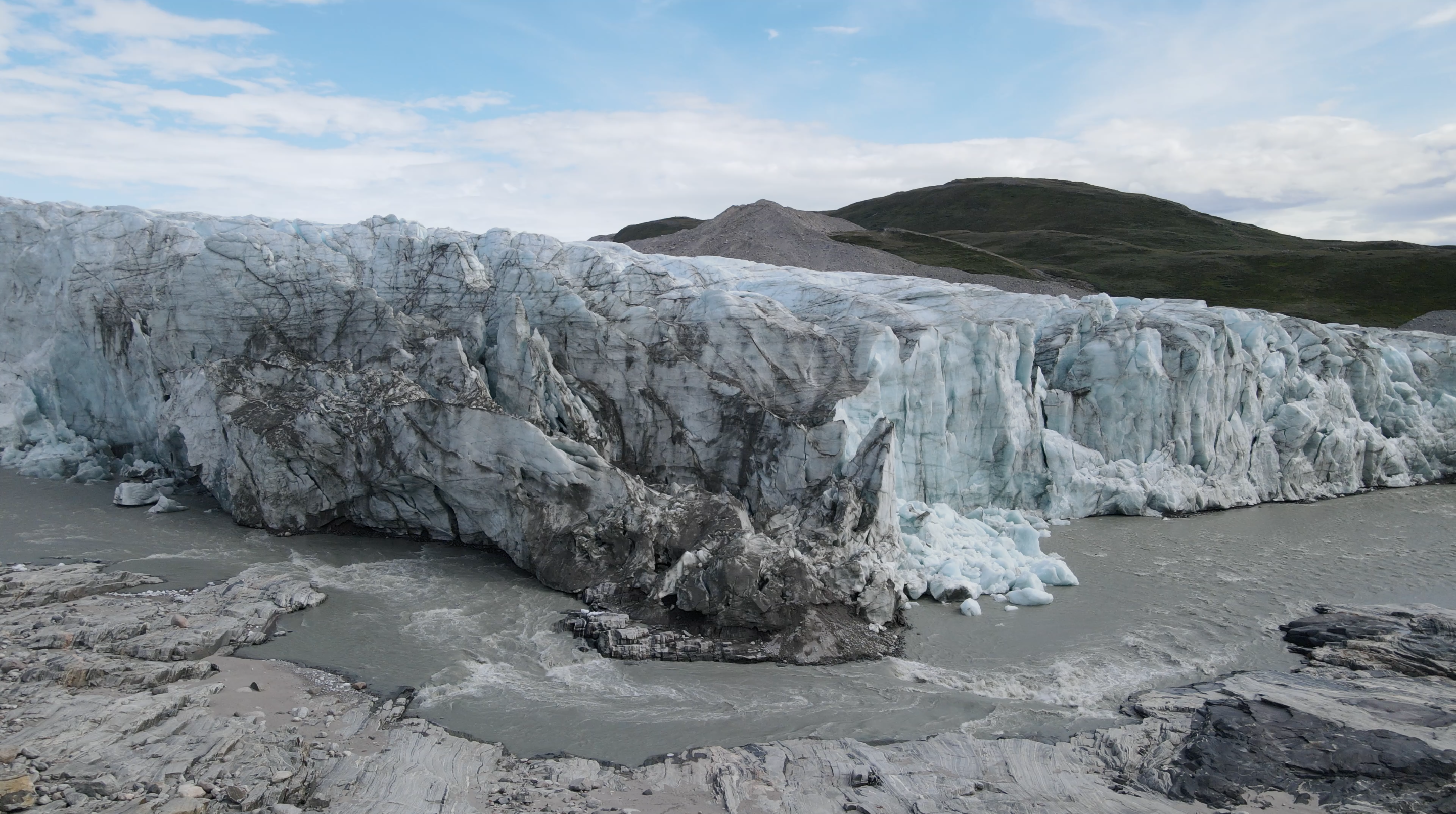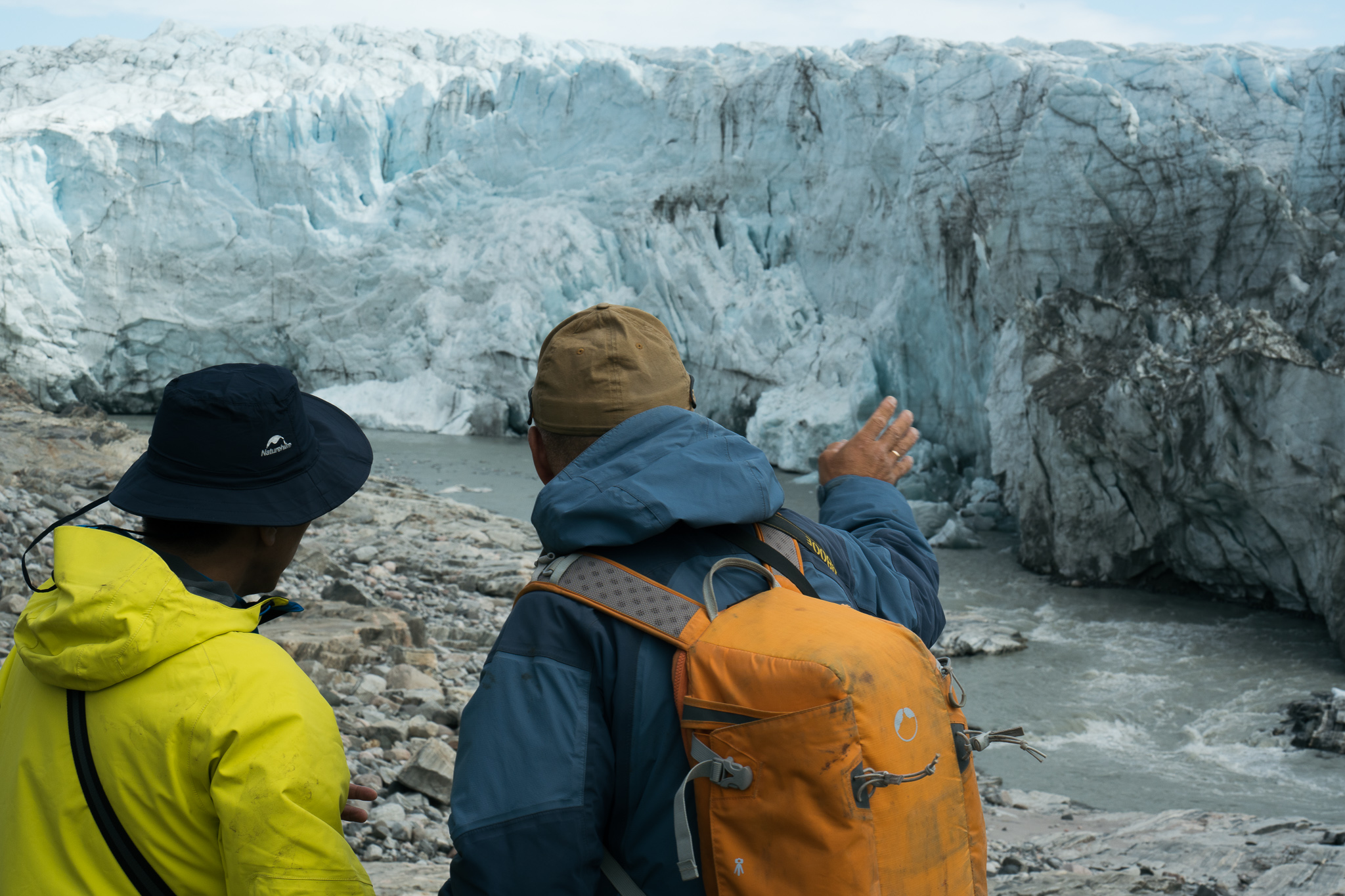 「這裡昨天才發生過崩落。」他秀出昨天同一位置錄下的冰山崩落影像,和我們分享羅素冰川的過去到現在,並指著冰川後方的綠色山頭,告訴我們:「那裡在五年前還是白色的,但是現在已經看不到冰了。」