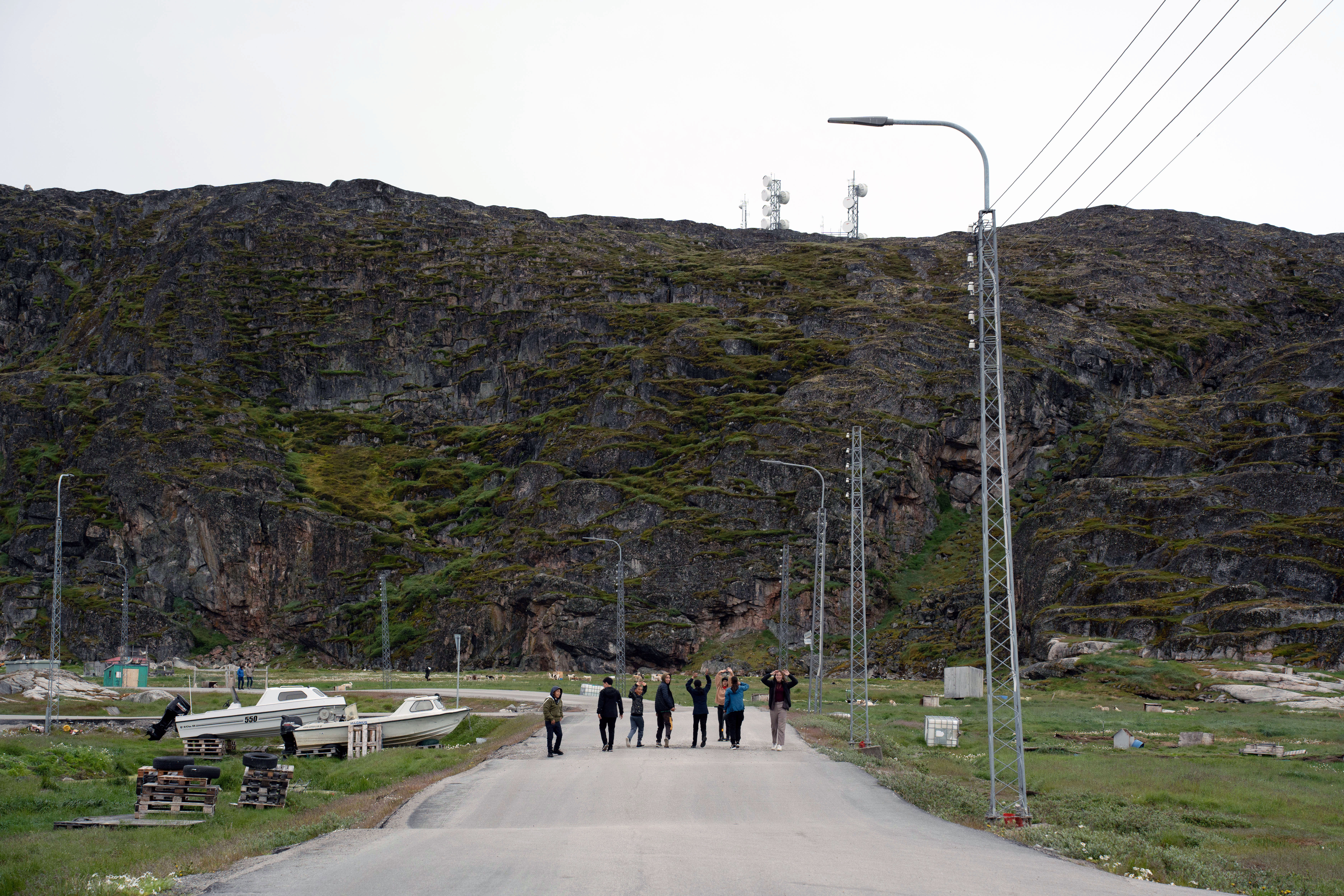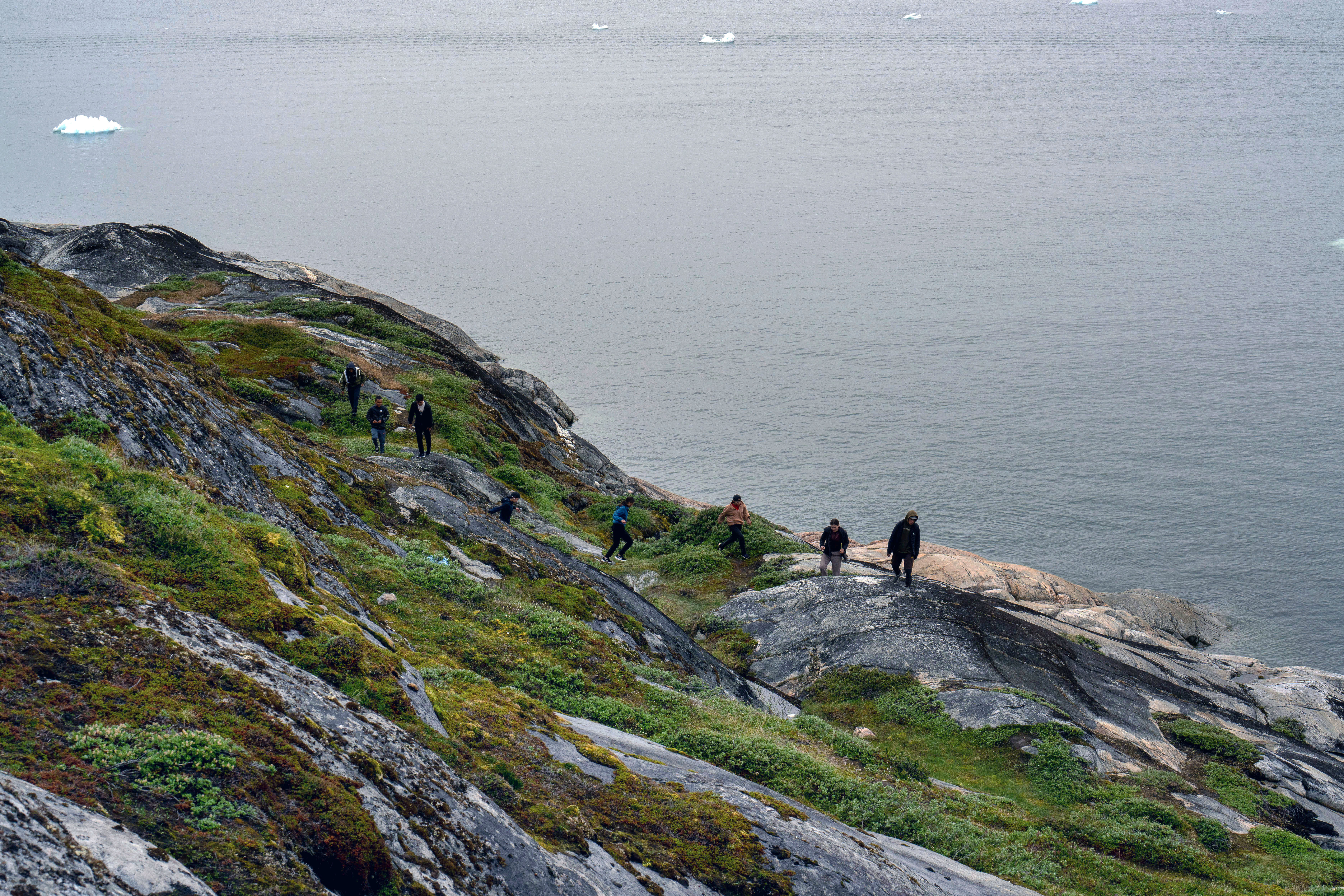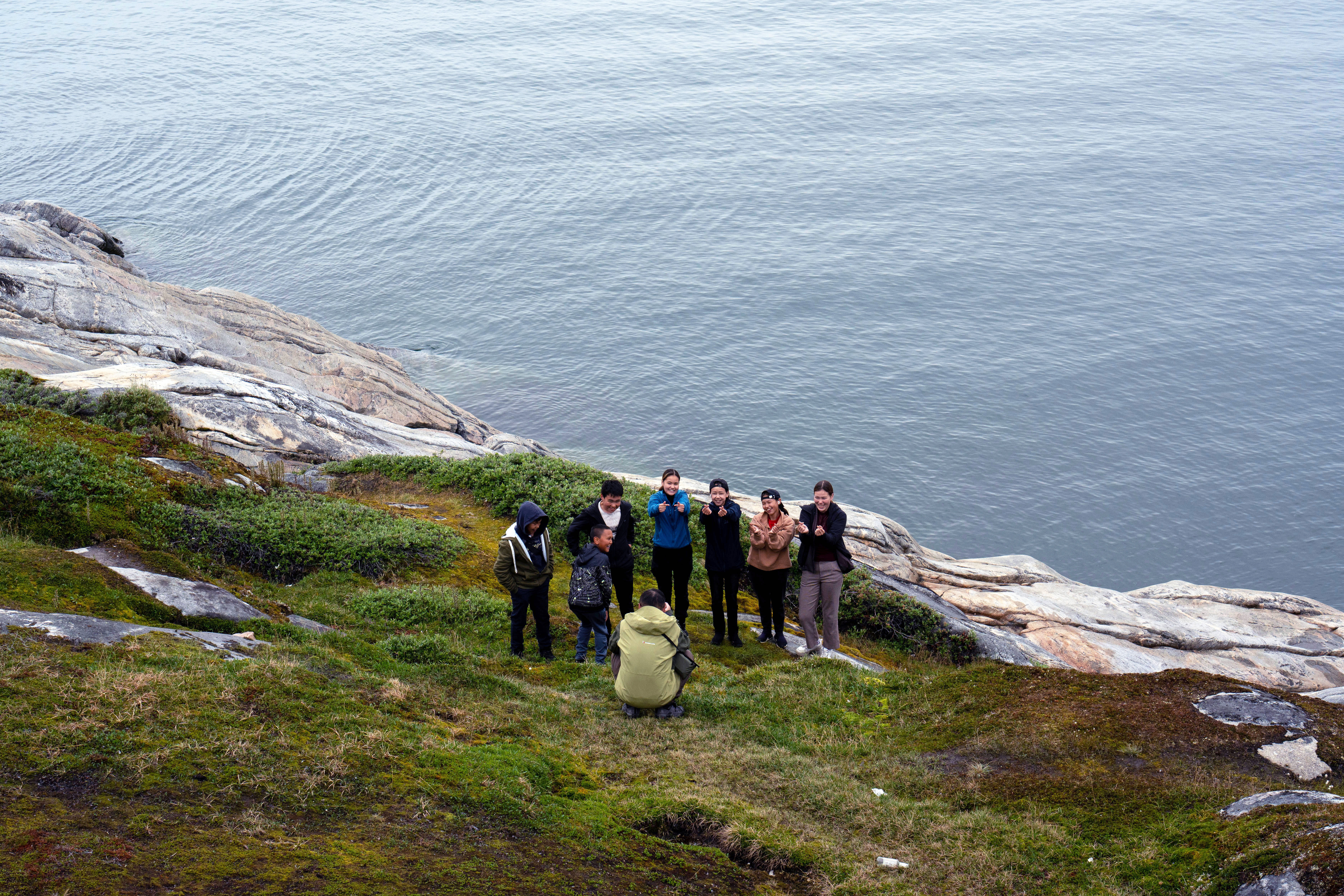 抵達格陵蘭航空臨時安排的民宿後,丟下行李,我們帶著相機步行到城鎮最邊緣的制高點,前幾天都沒有時間可以爬到這裡,是伊魯利薩特最有特色的Hiking路線,可以一覽鎮上的彩色小房子與海上浮冰的大全景。意外的好運氣,讓我們遇見了一群當地的青少年,在晚上八點天色還是一樣亮的永晝夜裡,他們快樂地在海邊山壁上自由穿梭,一邊唱歌、一邊打鬧玩耍。