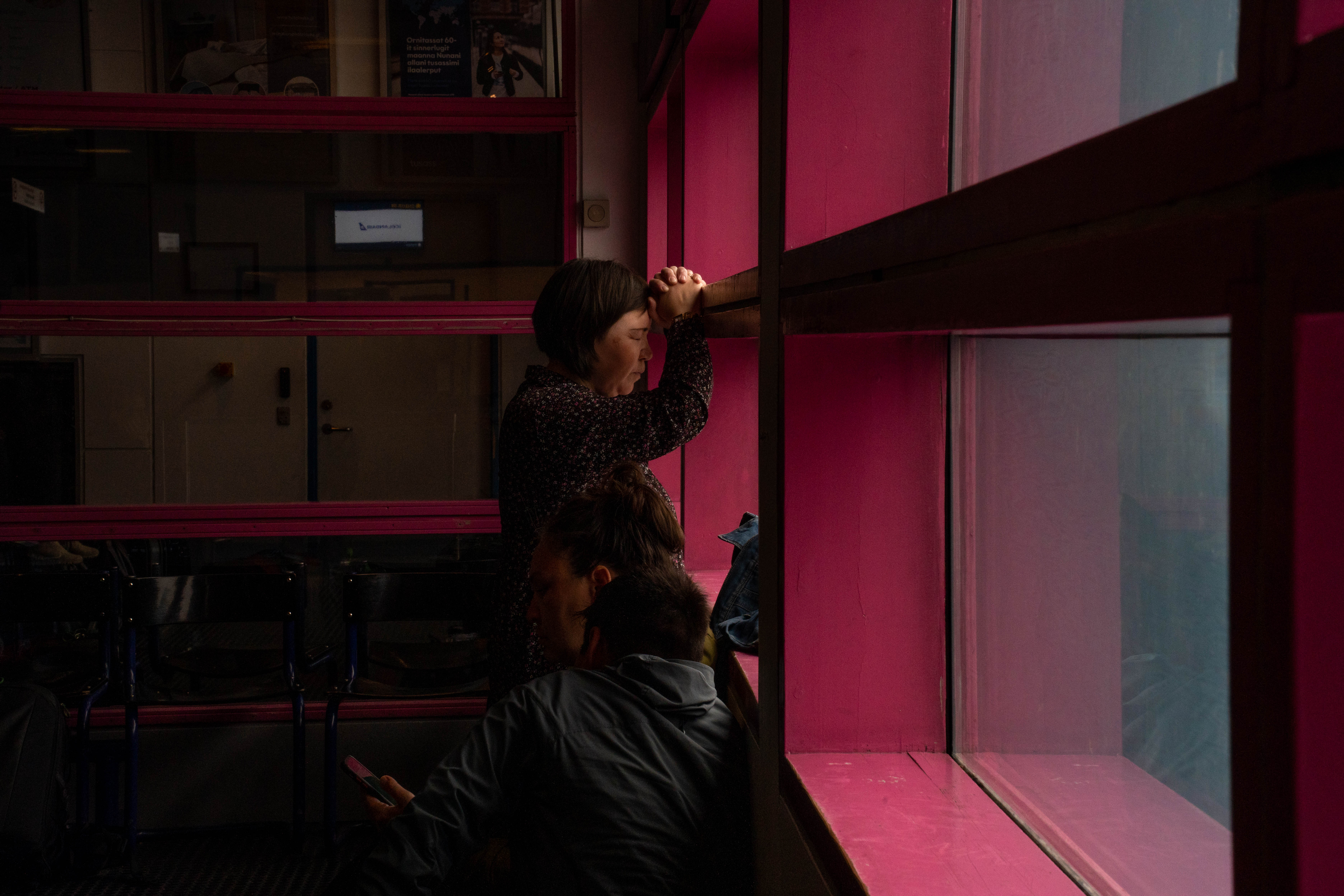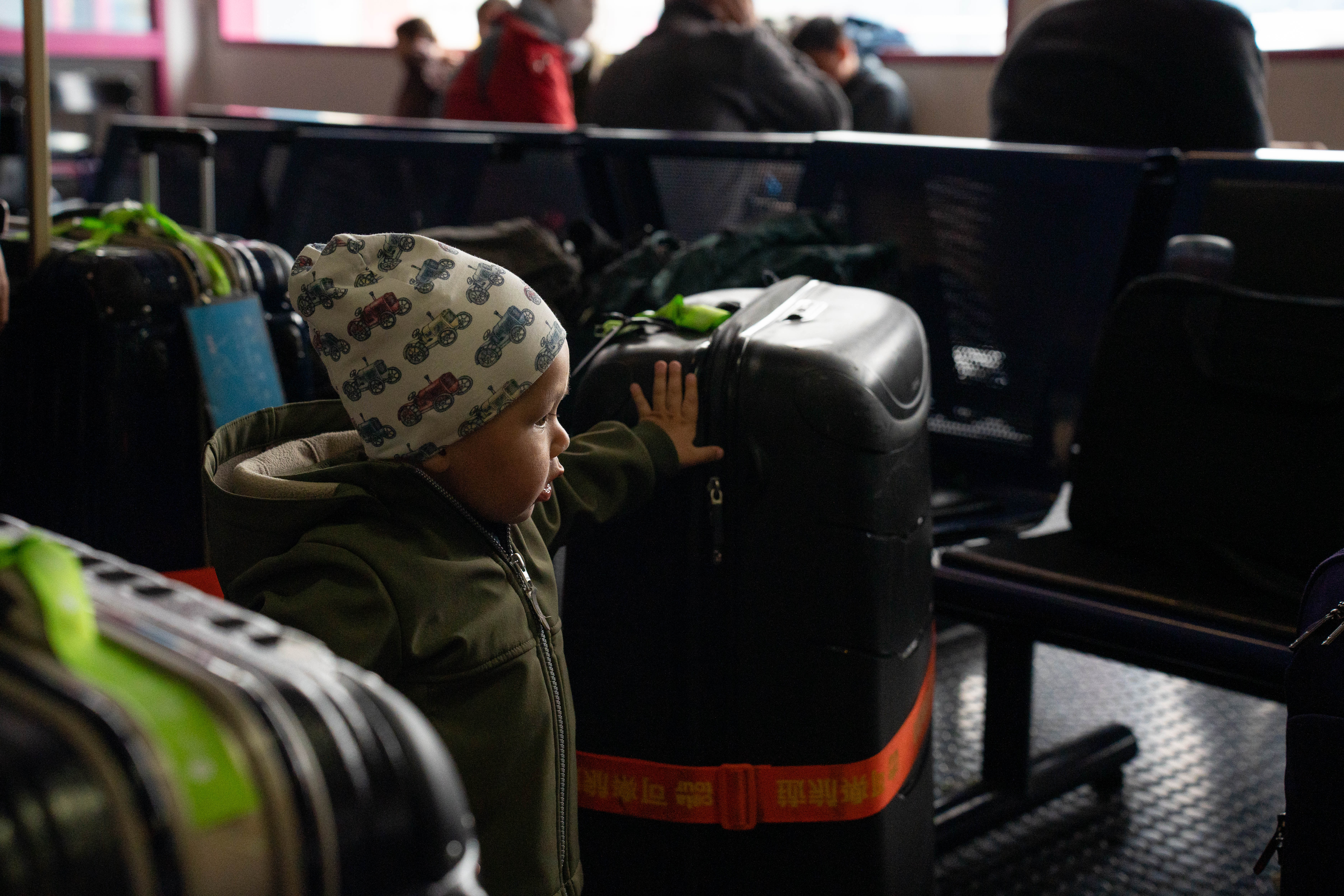 滯留的旅客們擠滿機場大廳,但機場裡卻很安靜。感覺得出旅客們焦慮與凝重的心情,他們不時望著窗外被濃霧覆蓋、空盪盪的停機坪,或打牌打發候機時間。等待的時間漫長,機場裡的孩子們也漸漸聚在一起玩耍,在大大小小的行李間跑跳穿梭。於是小小的機場裡,一下子又滿是孩子們的笑聲。