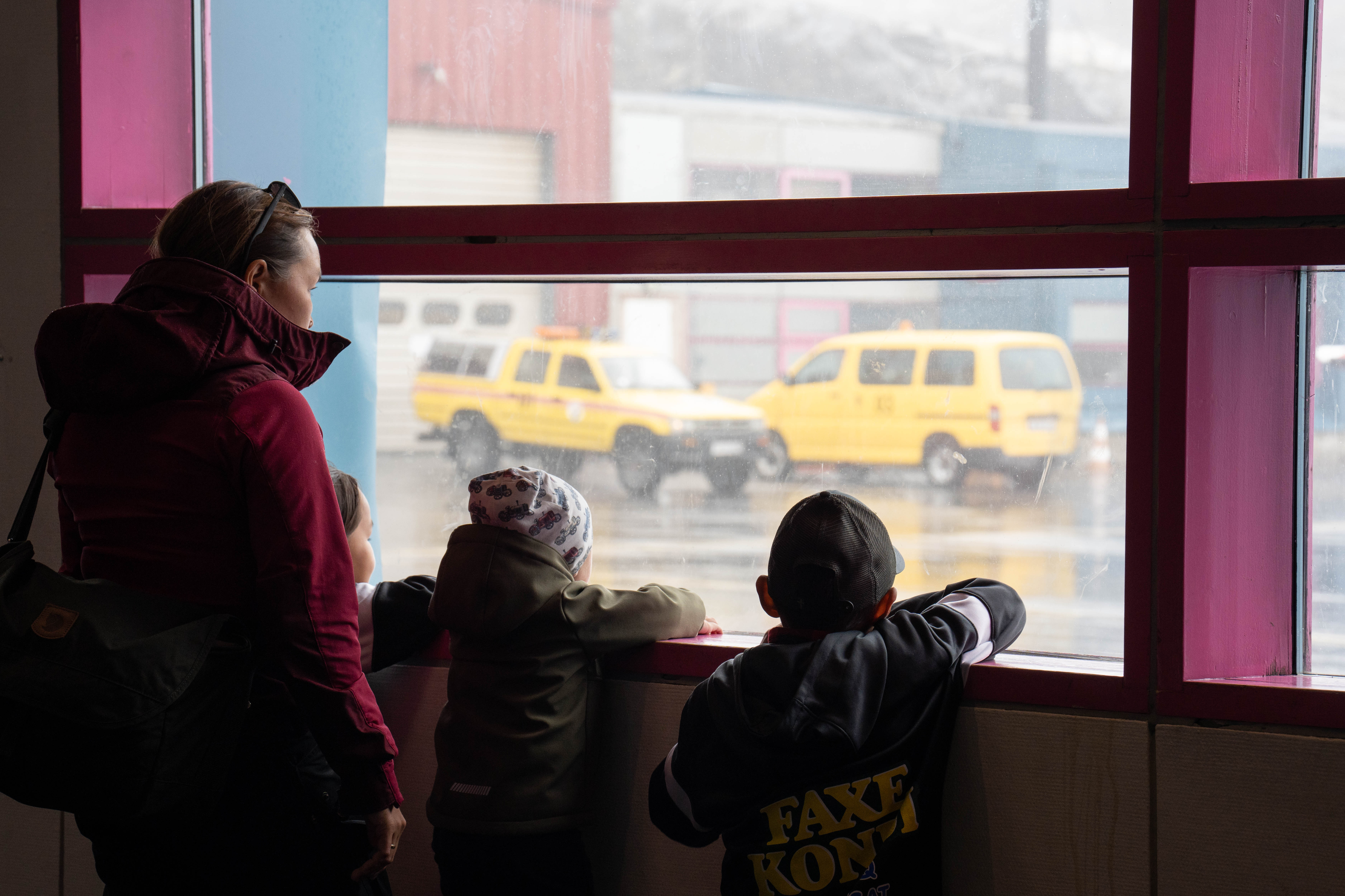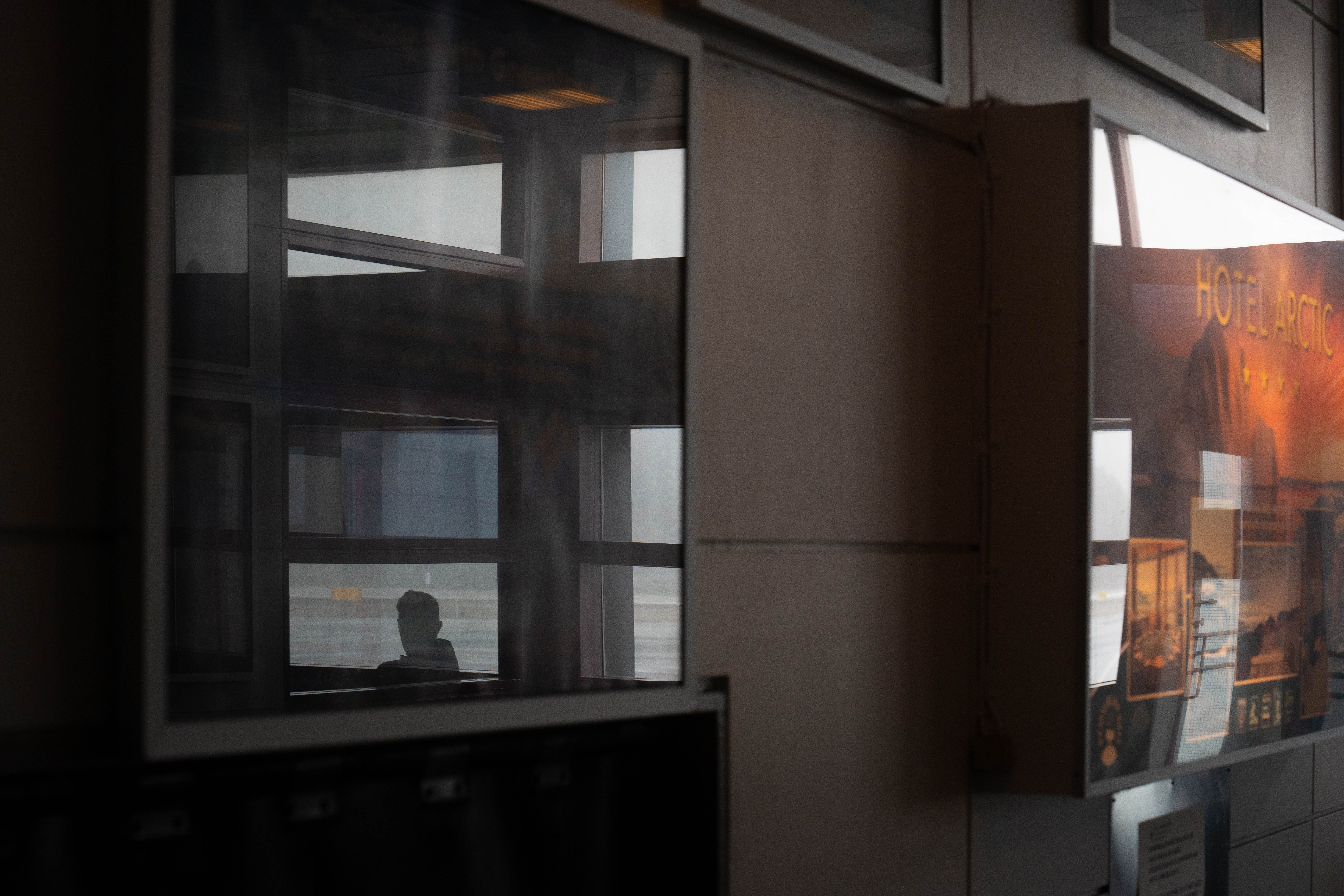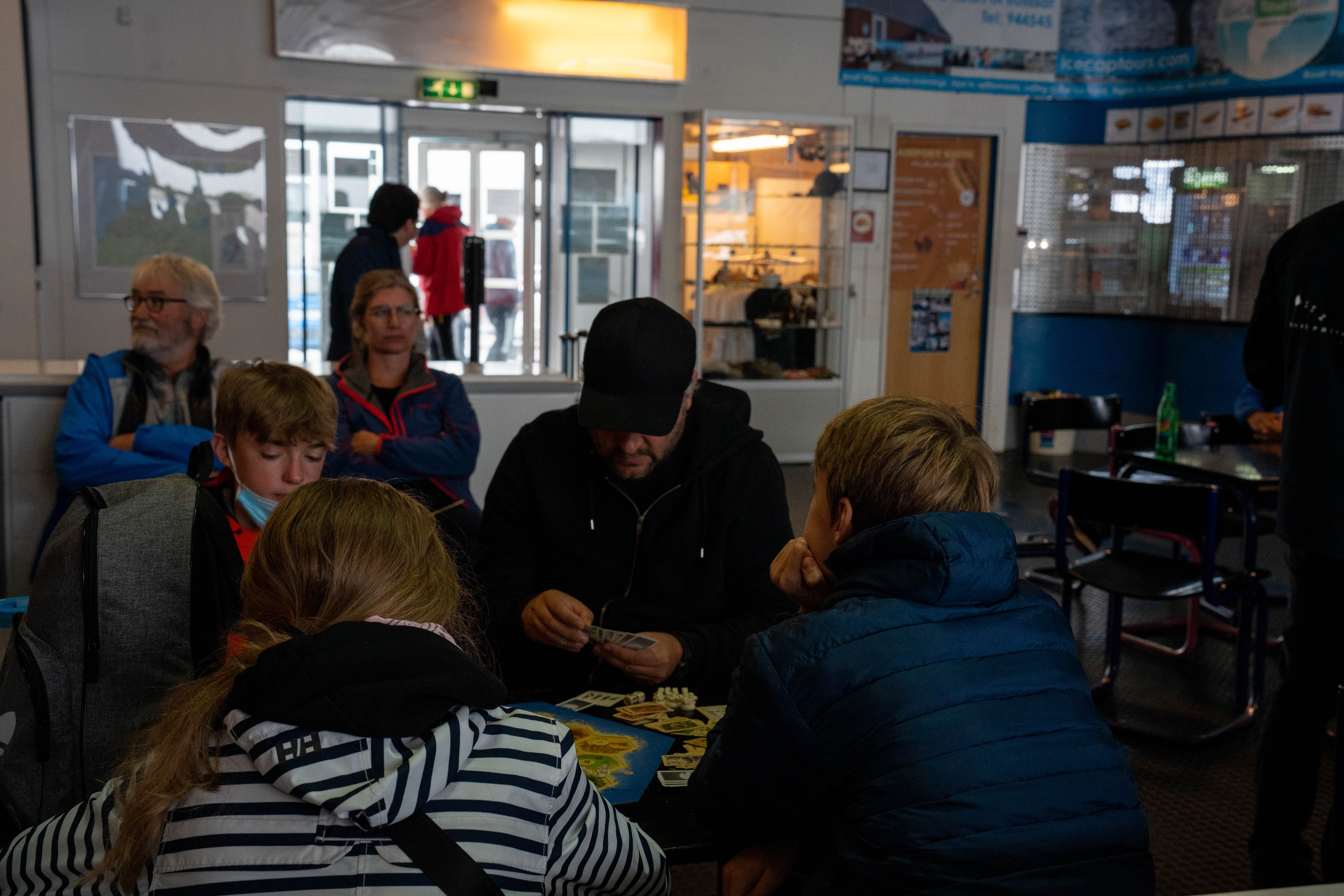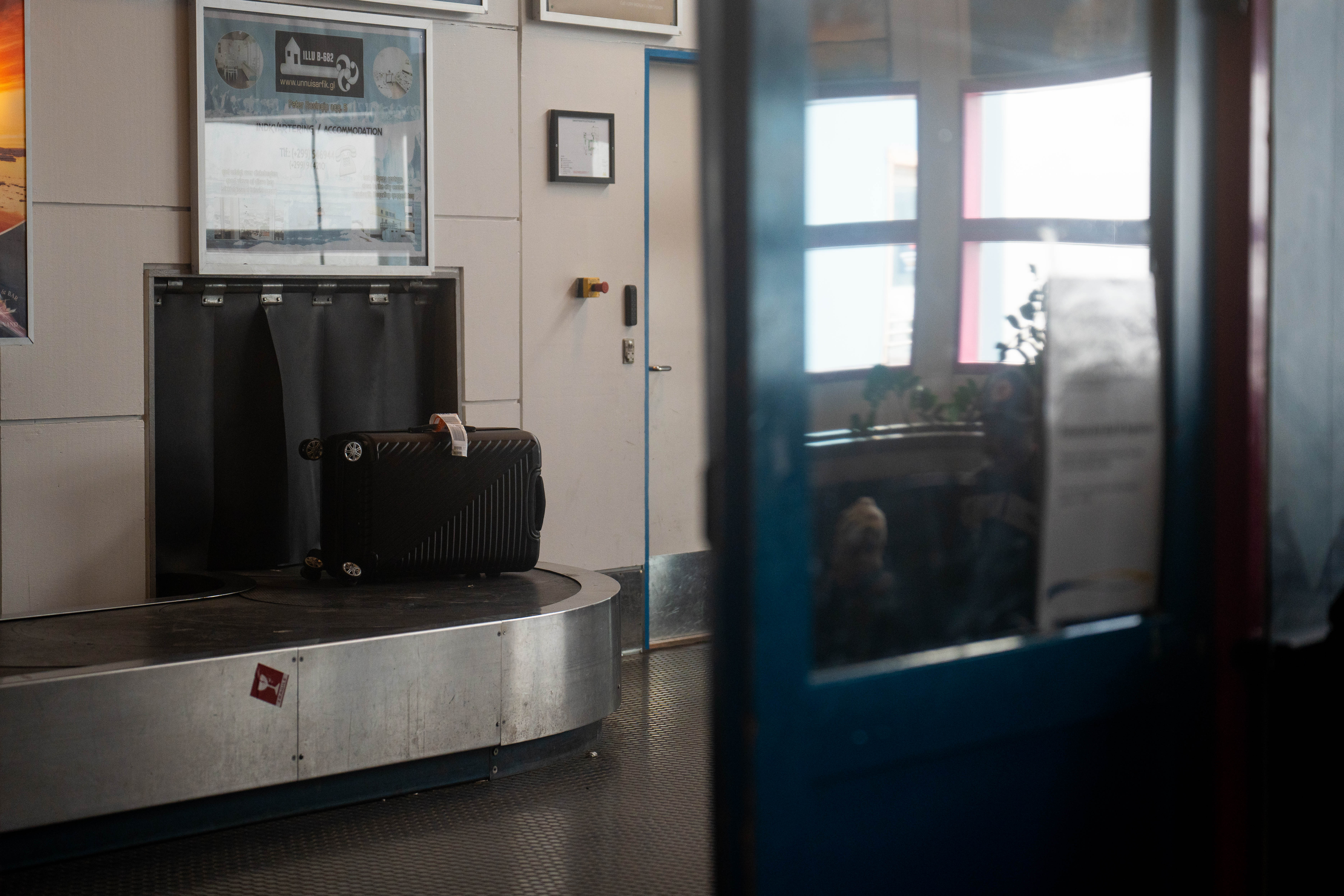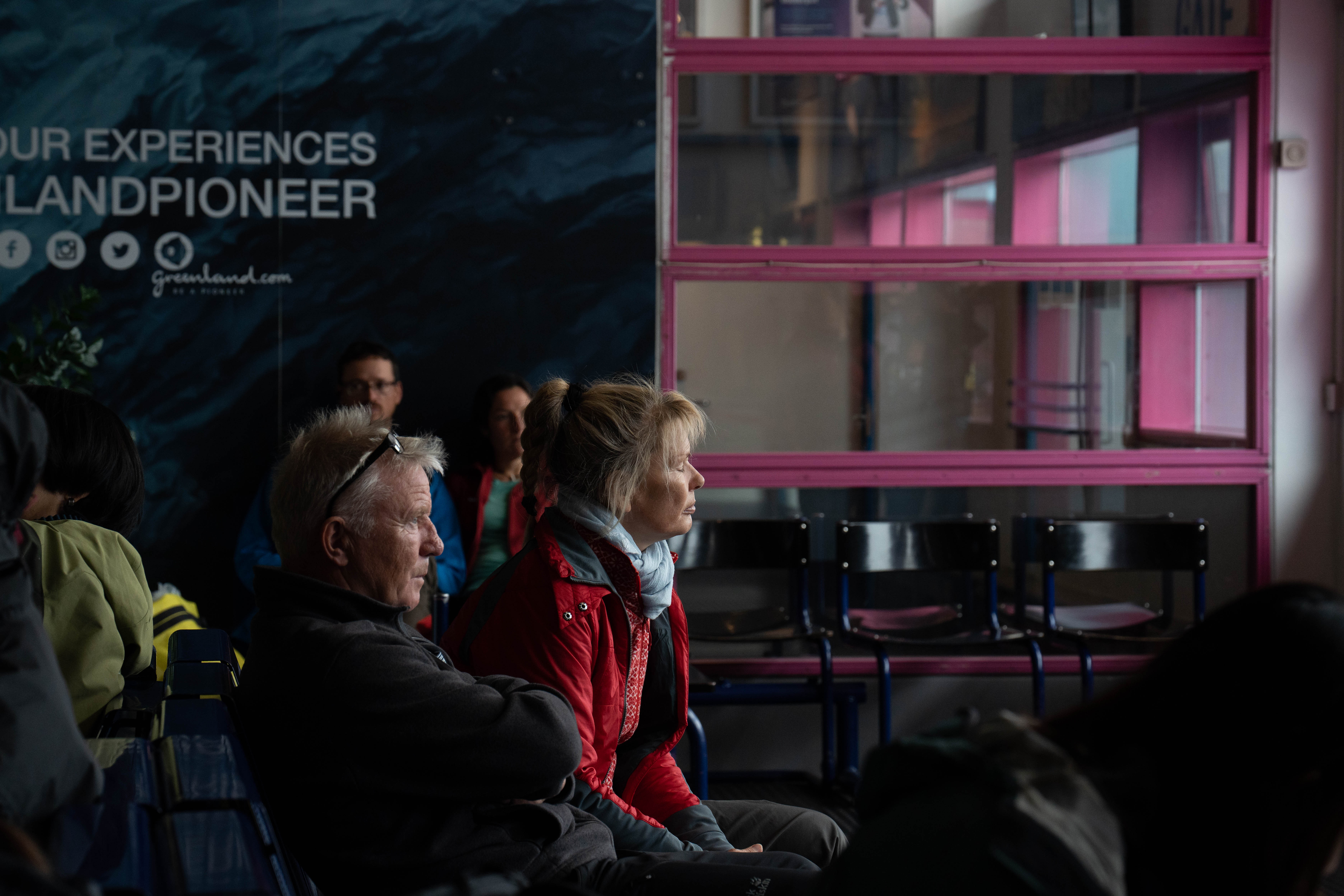 接近中午左右,伊魯利薩特起了濃濃大霧。伴隨著細雨的濃霧從冰峽灣吹進來,短短十幾分鐘,很快地就看不見遠方的冰山了。我們按照原定計畫趕路到了機場,準備要從伊魯利薩特飛回康克魯斯瓦格,但由於起大霧導致班機延誤,上一班飛機還在空中盤旋,等候安全降落的指示,各國旅客們滯留在小小的機場裏等候安排。