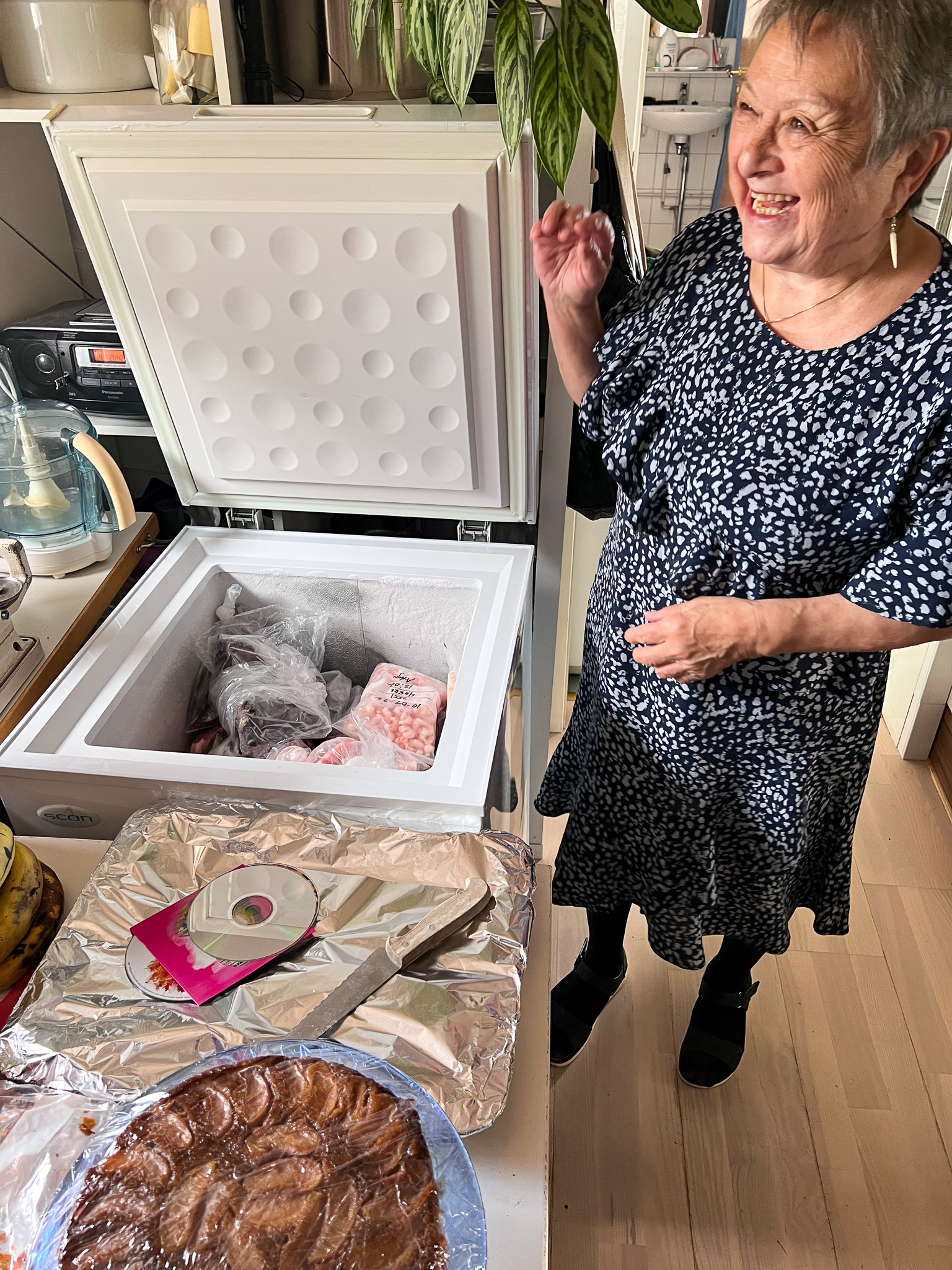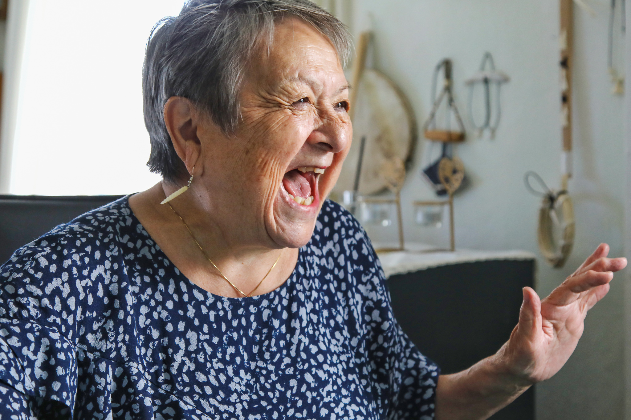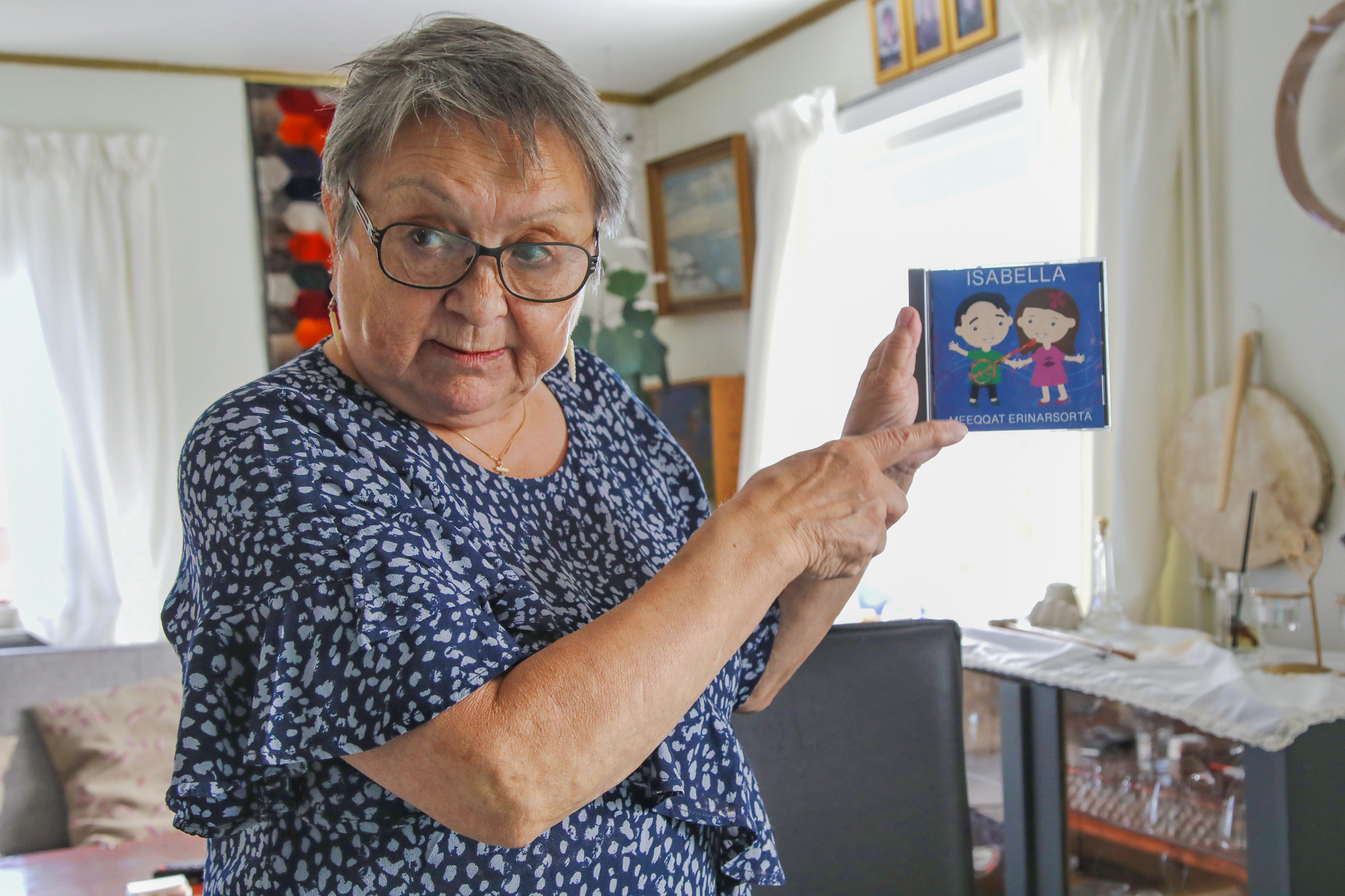 她是自得其樂的老人家。她畫畫、寫歌、縫紉、烘焙。她有兩個大冰櫃,開心地展示「阿嬤的冰箱」裡囤積過冬的食物:抓出兩條大鮭魚、海豹肉、一袋鯨魚肉,「這個很讚!」八月一日開始的狩獵季,她就會有新鮮的麝香牛肉可吃了。
