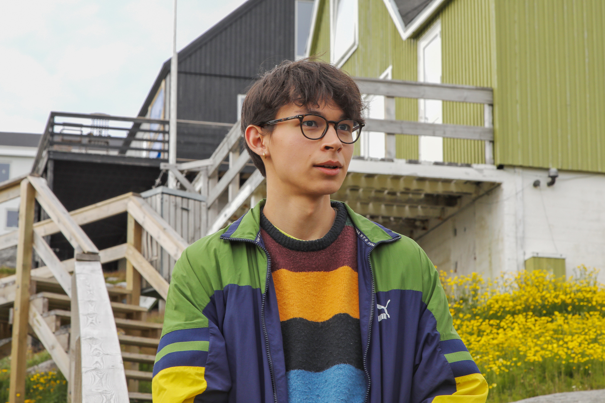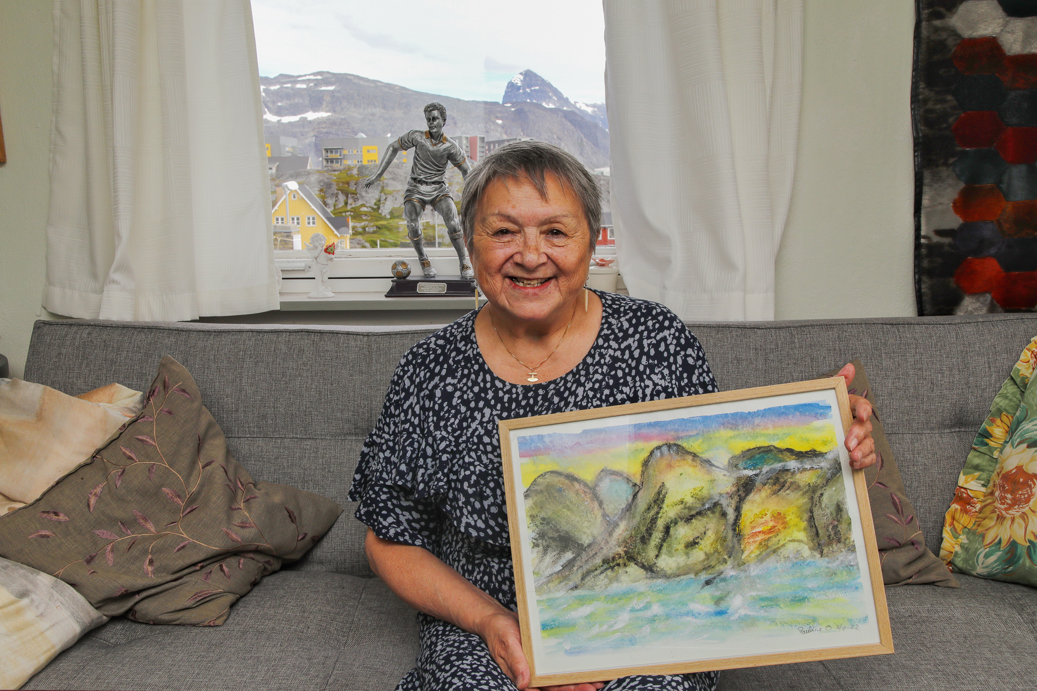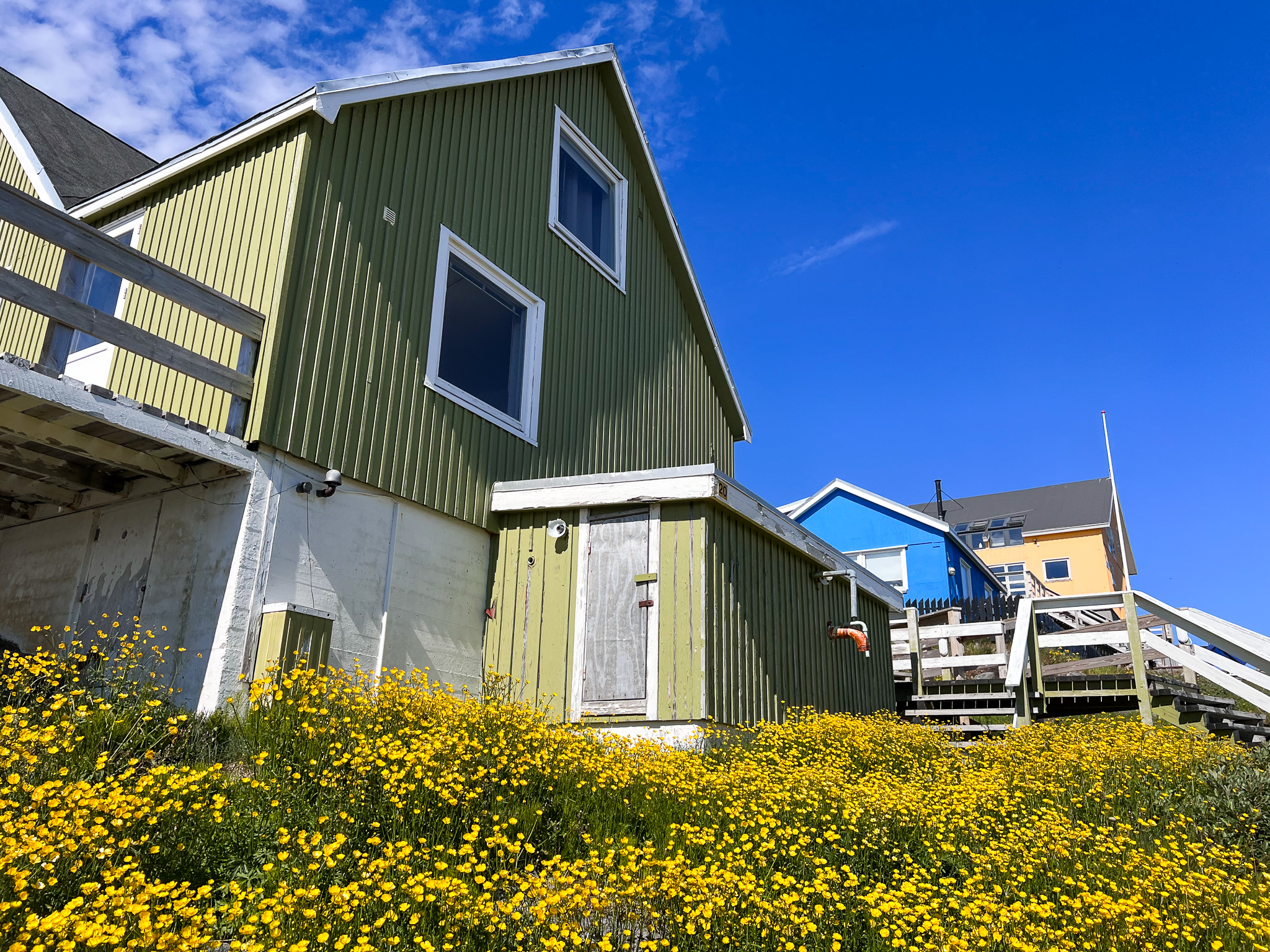 76歲的寶琳.歐森(Pauline Olsen)和女兒多蒂(Dorthe)聽到鄰居的狗叫聲,出來站在山坡小屋門口迎接我們。小木屋在格陵蘭首都努克的鬧區外,不再有大樓,而是遠望可見大海的社區。彩色的木屋散落在開滿小黃花的山坡上 ,木梯沿著草坡而上;遠方海面上,一塊孤獨的海冰在太陽下閃耀。