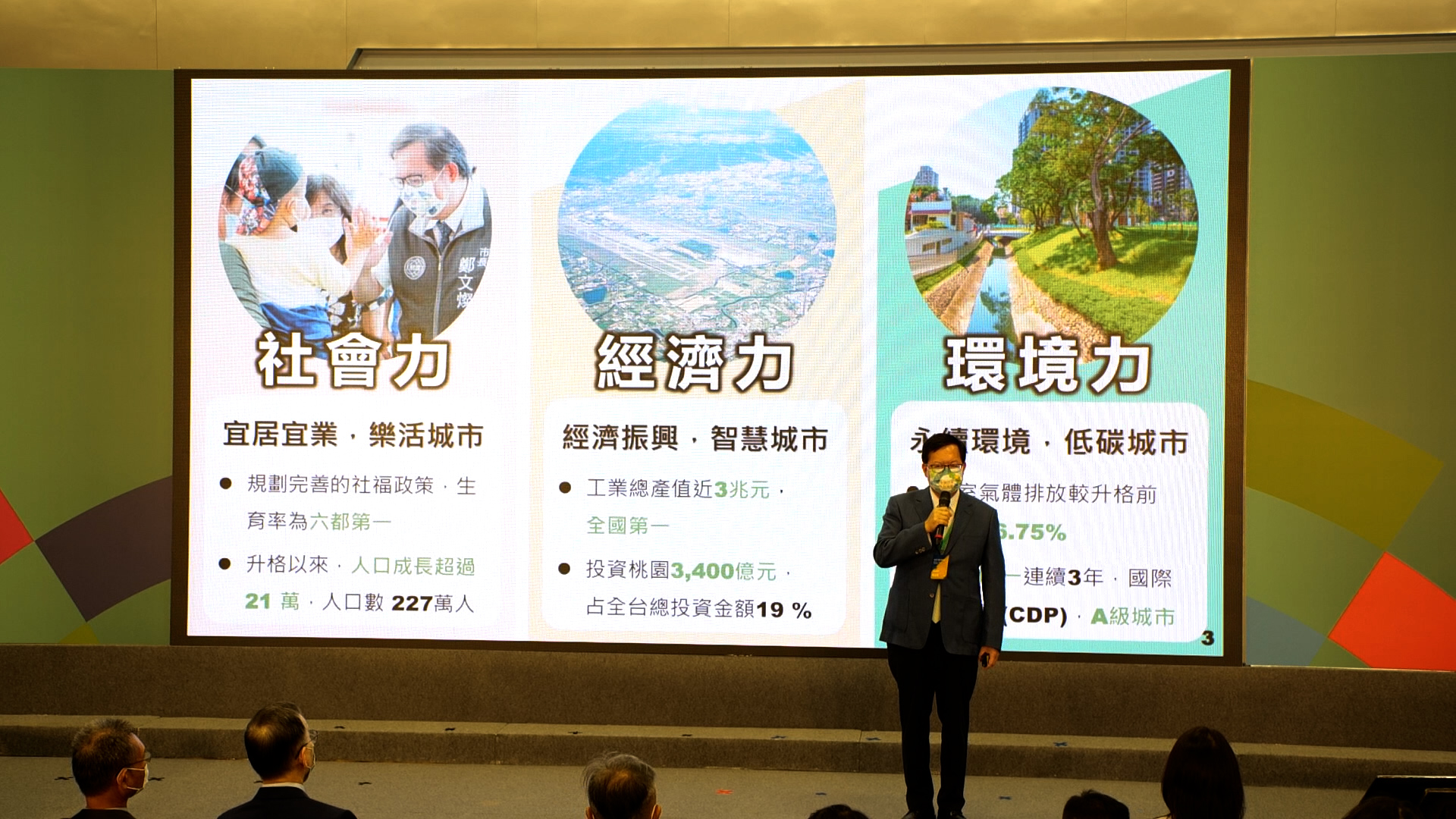 社會力、經濟力與環境力結合,是桃園市推動永續城市的策略。鄭文燦指出,桃園市是六都唯一人口正成長、生育率最高,率先開辦「333育兒政策」,生育津貼3萬元,3歲以下育兒津貼每月3千元,上任後也開始推動社會住宅、長照普及,目前更積極建構桃園捷運路網,希望打造北北桃一小時生活圈,讓桃園邁向永續城市。