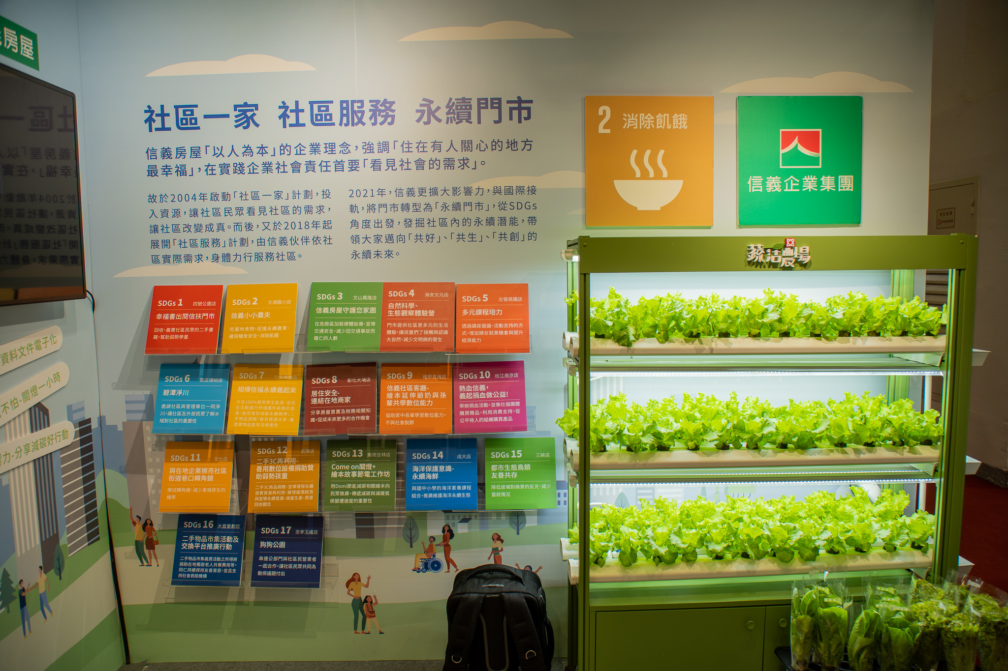永續企業區中,信義房屋近年推行智能賞屋,減少交通碳排成本與佈置耗材。信義房屋永續發展組專案經理蕭筠芝說,他們積極做門市轉型,將銷售據點經營為社區基地。蕭筠芝以在文湖國小實施的「蔬活農場」為例,除了讓學童們看見蔬菜生長過程,也結合飲食計畫的推行,是推動永續發展的佳例。