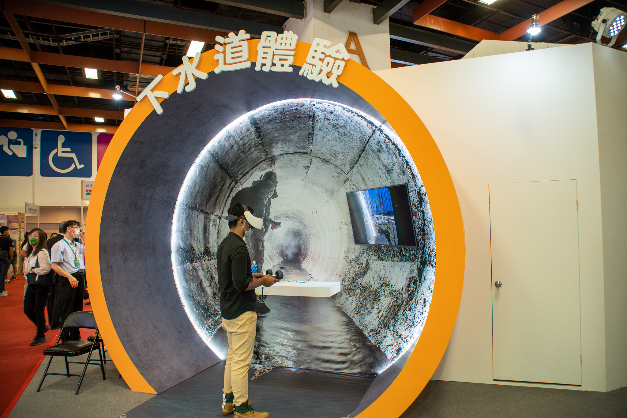 內政部營建署讓民眾以VR裝置模擬體驗下水道環境,理解地下水道系統的路徑、處理方法等知識。記者蔡宗儒/攝影