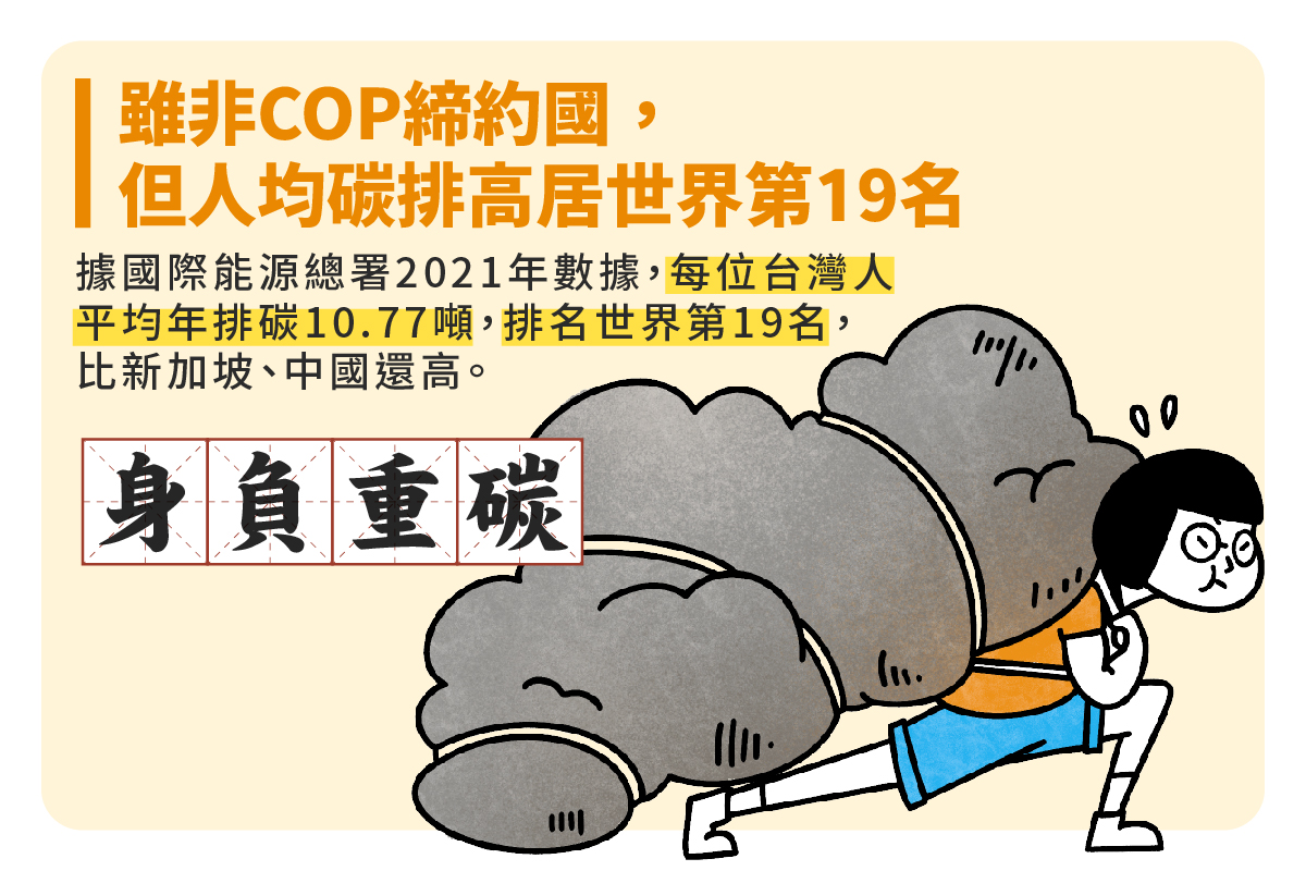 ➥ 台灣非聯合國會員,也不是COP的締約國,但是在氣候外交、供應鏈要求等壓力下,仍應積極減碳,跟上國際間淨零排放的趨勢。據國際能源總署2021年數據,每位台灣人平均年排碳10.77噸,排名世界第19名,比新加坡、中國還高。