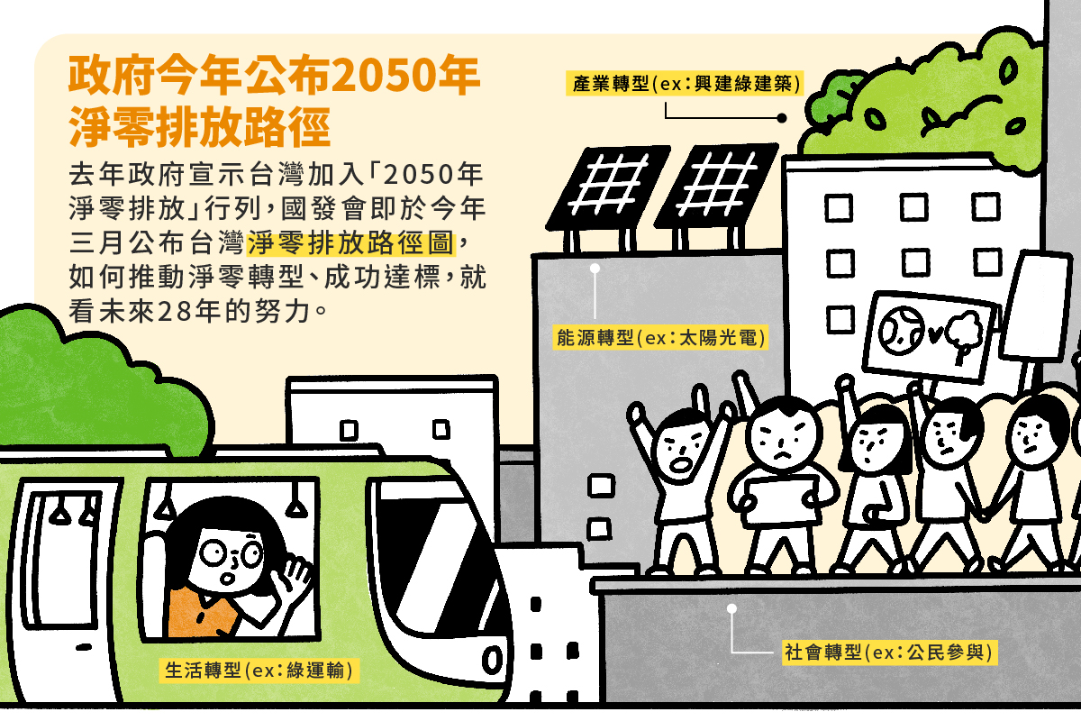 ➥ 去年世界地球日,蔡英文總統首度宣示台灣加入國際「2050年淨零排放」的行列。今年三月,行政院國發會公布台灣淨零排放路徑圖。政府如何推動淨零轉型,帶領台灣成功達標,有待未來28年努力,也還需要提出短、中期的具體轉型計畫。