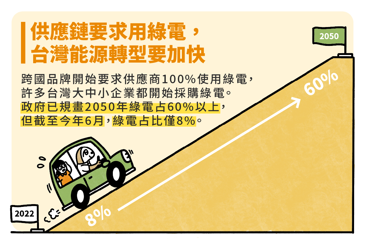 ➥ 跨國品牌開始要求供應商100%使用綠電,因此台灣大企業、中小企業都開始採購綠電。政府已規畫2050年綠電占60%以上,但截至今年6月,綠電占比僅8%。如何加速綠電發展,並同時解決光電、風電的間歇性問題,避免停電成日常,是台灣政府未來必須面對的難題。