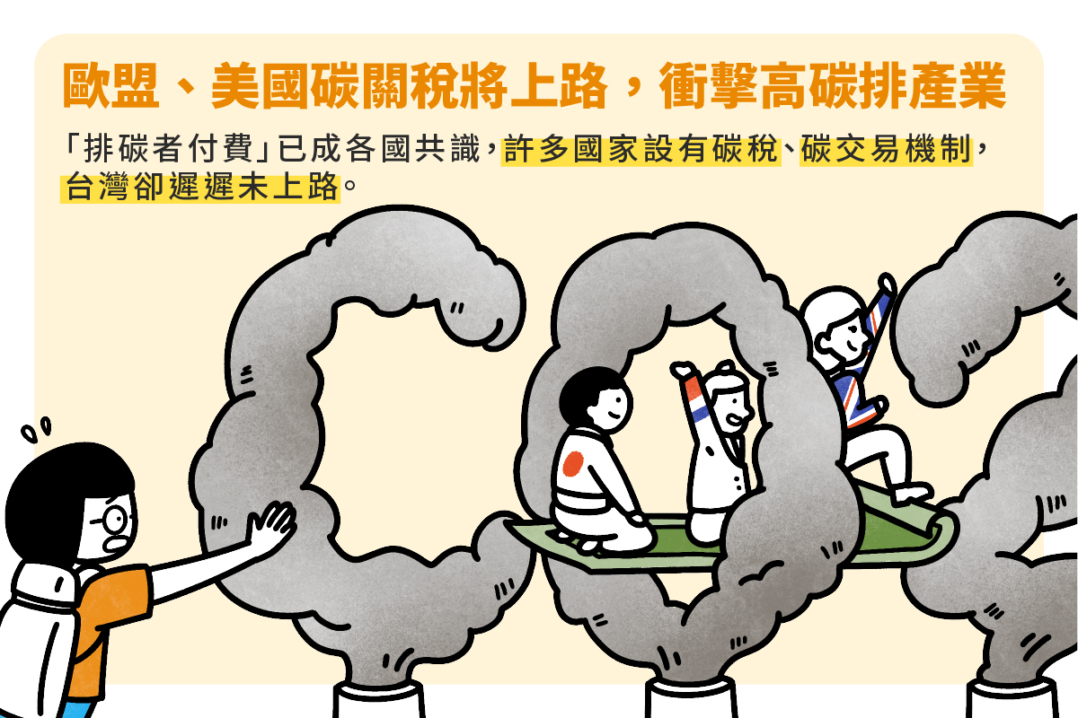 ➥「排碳者付費」已成各國共識,許多國家設有碳稅、碳交易機制,台灣卻遲遲未上路。歐盟已宣布2027年將徵收碳關稅(全名:碳邊境調整機制),美國、日本、韓國也正研擬中,未來將針對沒繳交「碳價」的進口商品收費。目前環保署規畫2024年推動碳費機制,但是價格未定。