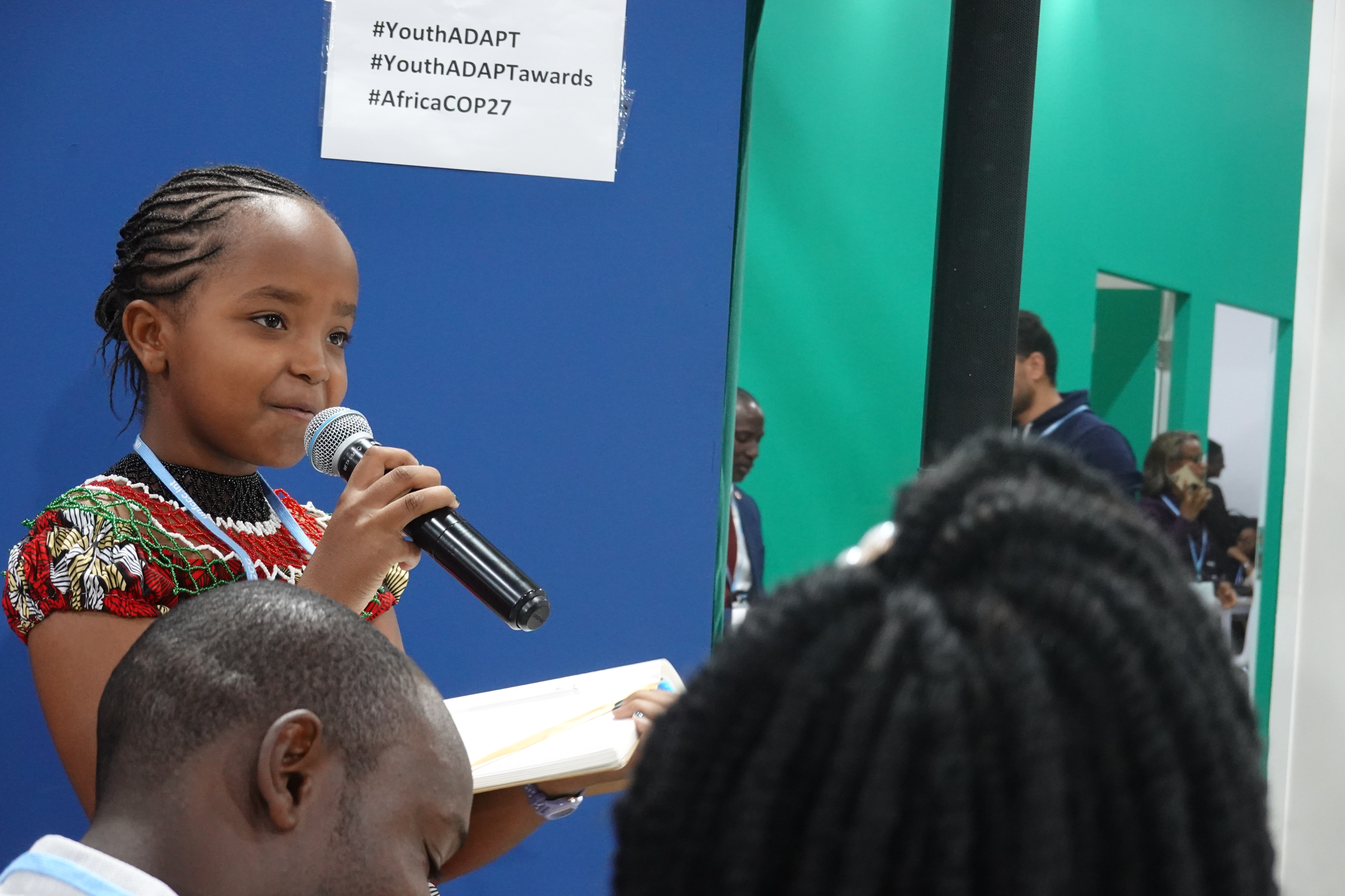 COP27年紀最小的NGO觀察員Kimani來自肯亞、今年九歲,今年因種樹對抗乾旱的計畫,拿到非洲開發銀行的青年調適獎。記者周妤靜/攝影