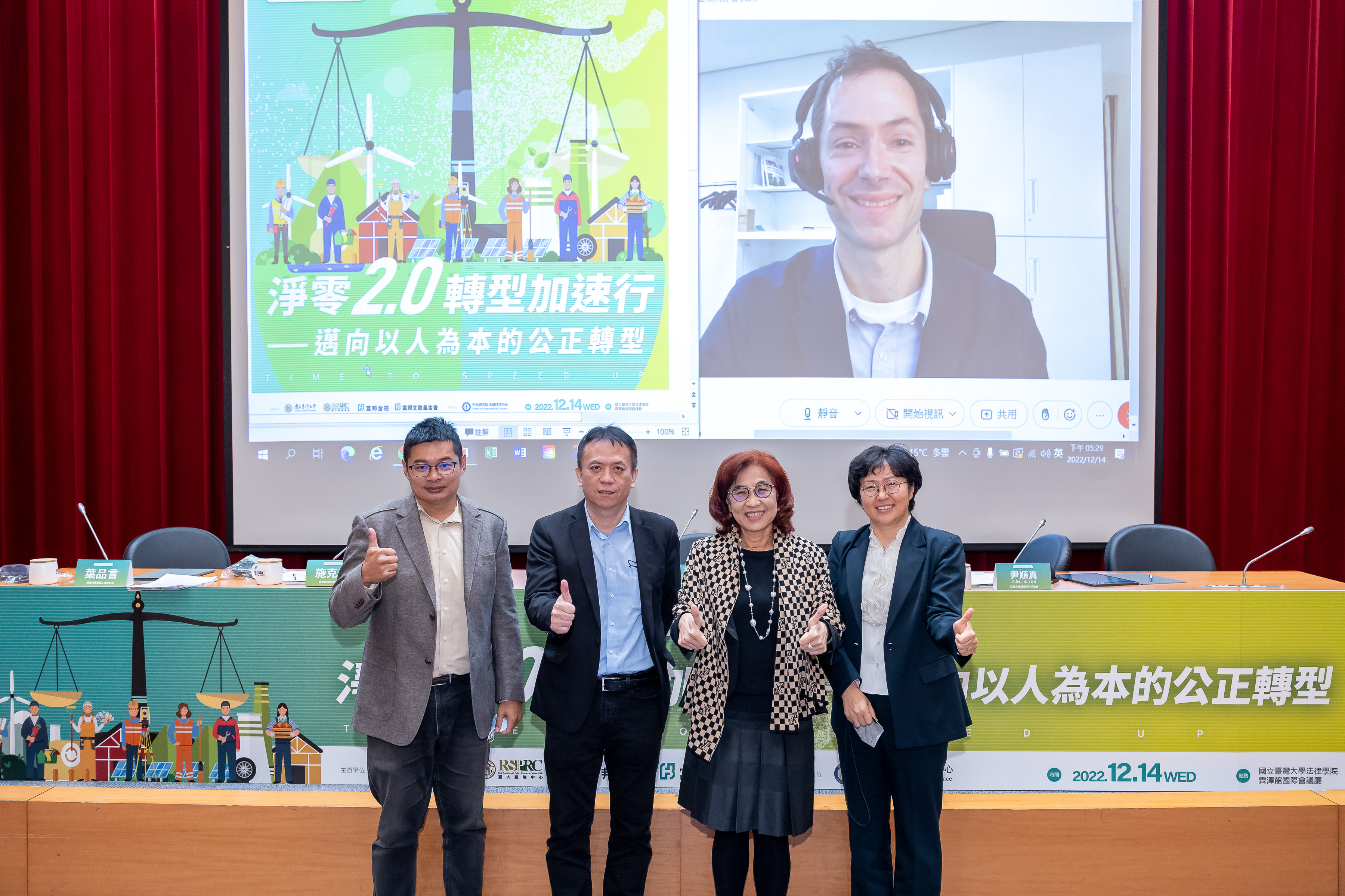 台灣、日本及韓國的與談者分享公正轉型的挑戰與實踐,左起為葉品言、施克和、楊瑪利、尹順真,以及遠端連線的Gregory Trencher。圖/台大風險中心提供