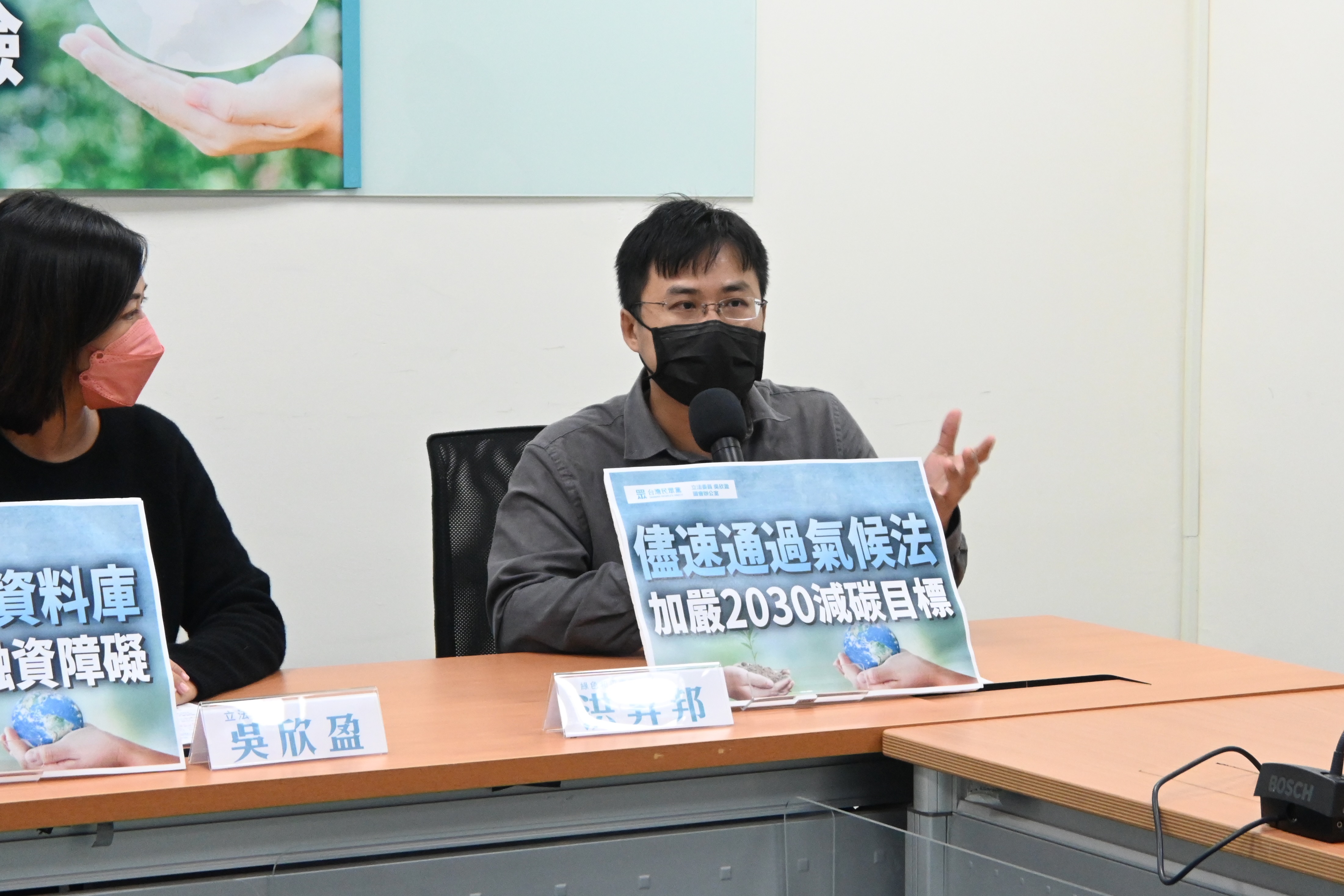 氣候法正於立院黨團協商,民眾黨立委吳欣盈與民間團體今(16)日召開記者會,呼籲政府加嚴2030年減碳目標,並建議政府先徵收碳費三年,後接軌碳稅。記者蘇彥誠/攝影