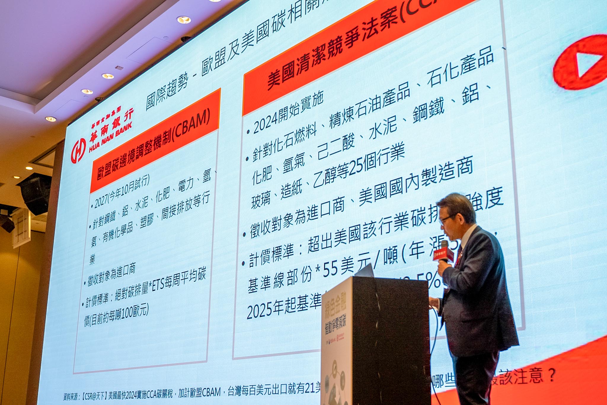 華南銀行副總經理張炳輝說明,「歐盟碳邊境調整機制」將於今(2023)年10月開始試行,初期針對水泥、鋼鐵等碳密集產品徵收碳關稅。台灣鋼鐵一年對歐盟出口50億美元,佔出口歐盟總合12%,首當其衝。