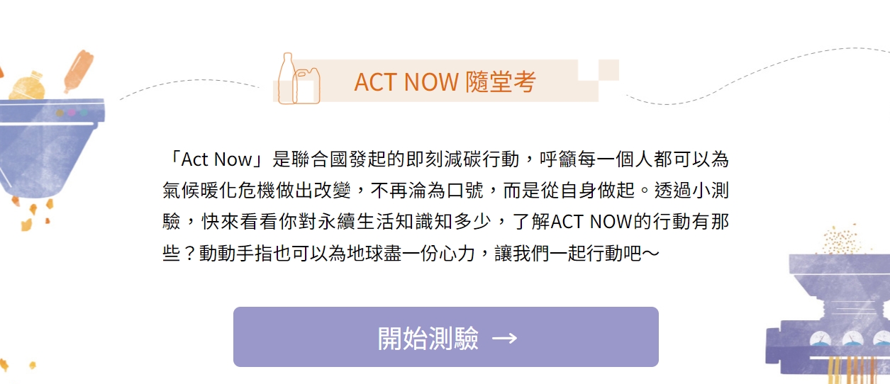 除了發動寶特瓶循環愛心傘外,願景工程還邀請國內17個機構團體提供題目,舉辦「ACT NOW永續測驗」。網站自六月上線以來,兩個月已經突破一萬人次上網「考試」,看看自己的永續知識是否及格。結果發現,有超過七成民眾不知道寶特瓶的正確回收方式,包括:蓋子要不要分開、瓶身標籤是不是要撕下來?如果你現在也不確定答案,請快上「ACT NOW小測驗」補修永續學分。