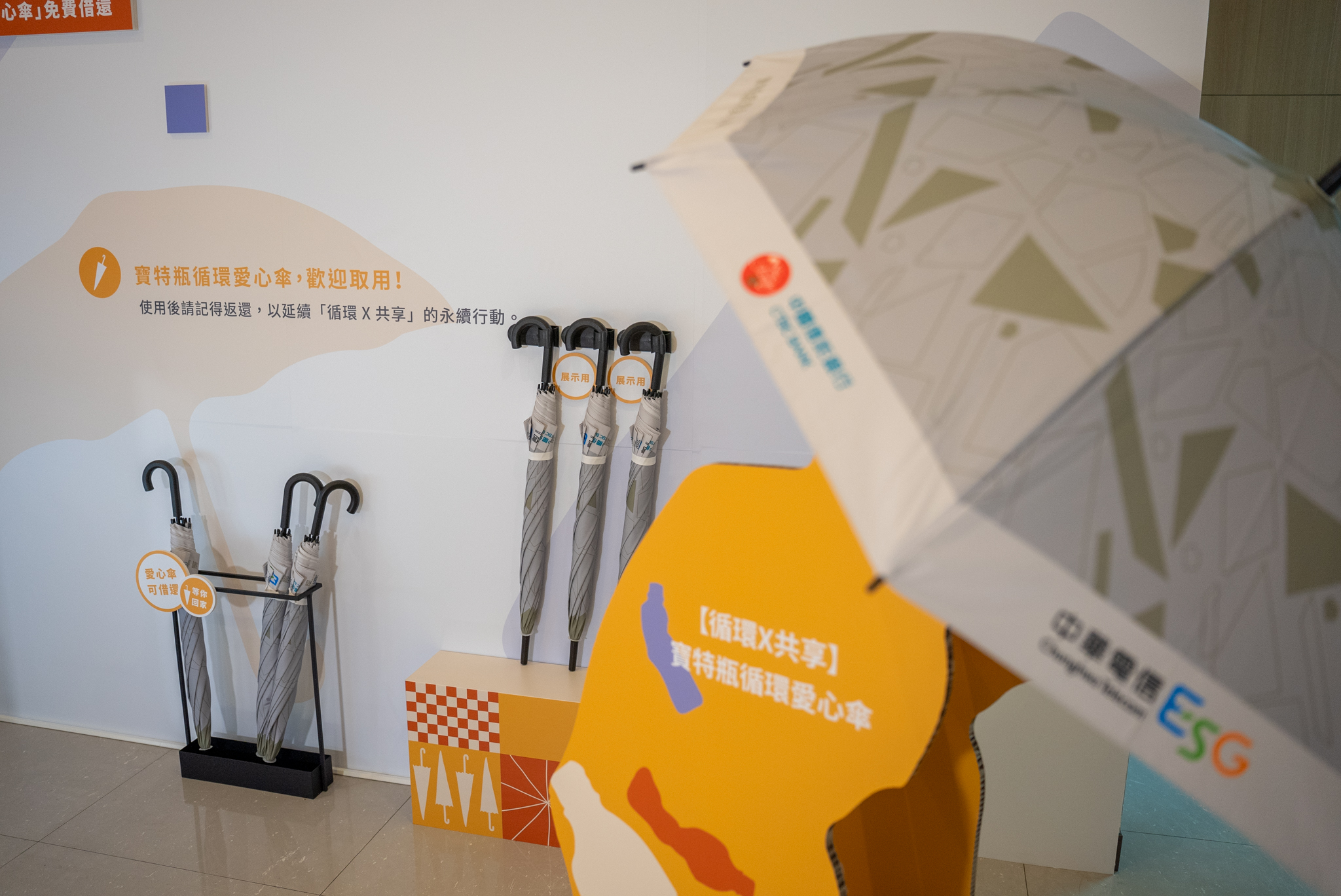 特展內可自由借取寶特瓶循環愛心傘並於中國信託門市、中華電信門市傘架區還傘,陰雨、晴天都好用。攝影/蔡宗儒