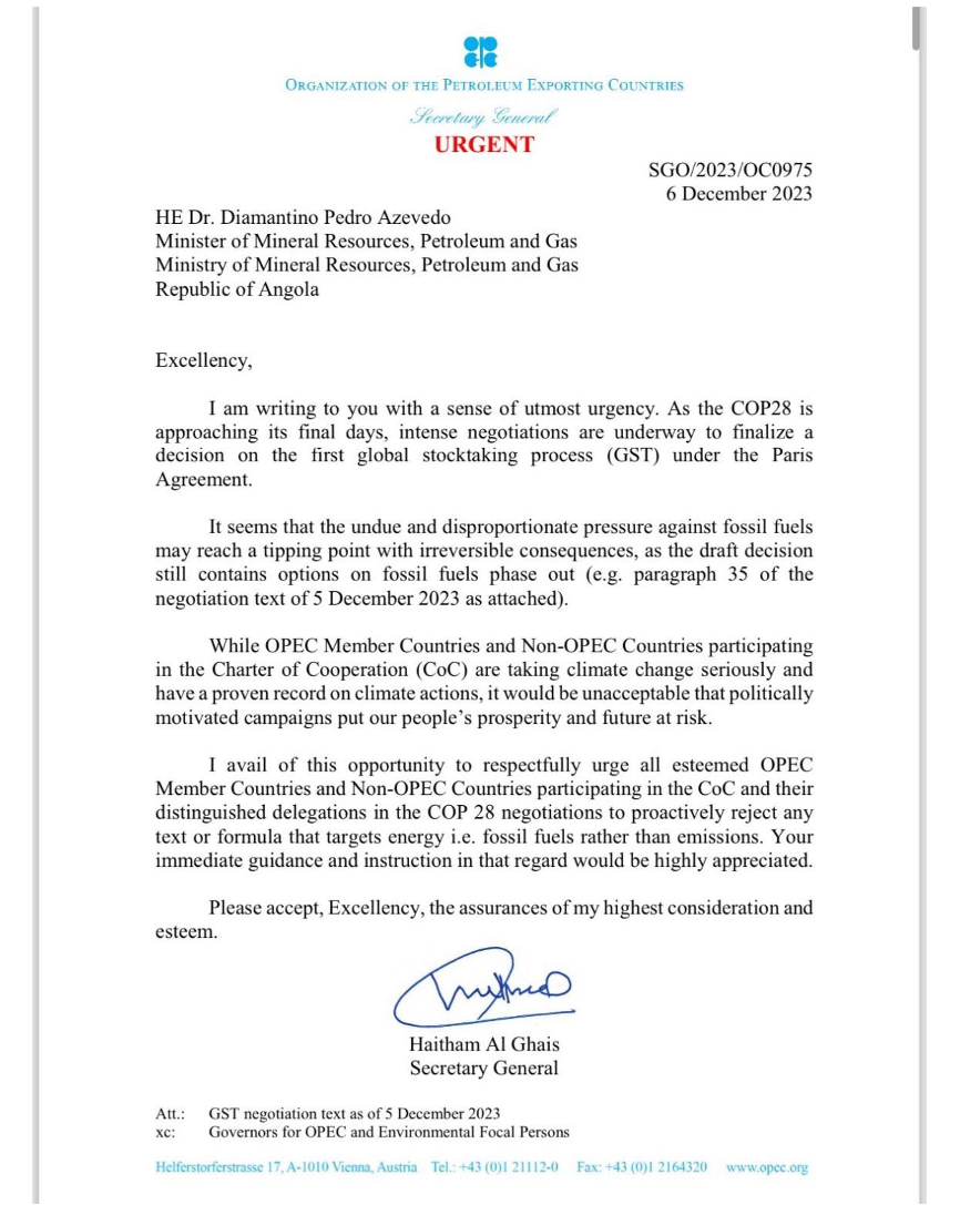 石油輸出國家組織(OPEC )12月6日發出緊急動員信,指出全球對於化石燃料反抗壓力已達臨界點、「全球盤點」協商文件中,仍見「化石燃料汰除」一詞,因此呼籲成員國於大會全力反對;任何聚焦於能源,而非排放的提案,均應否決。