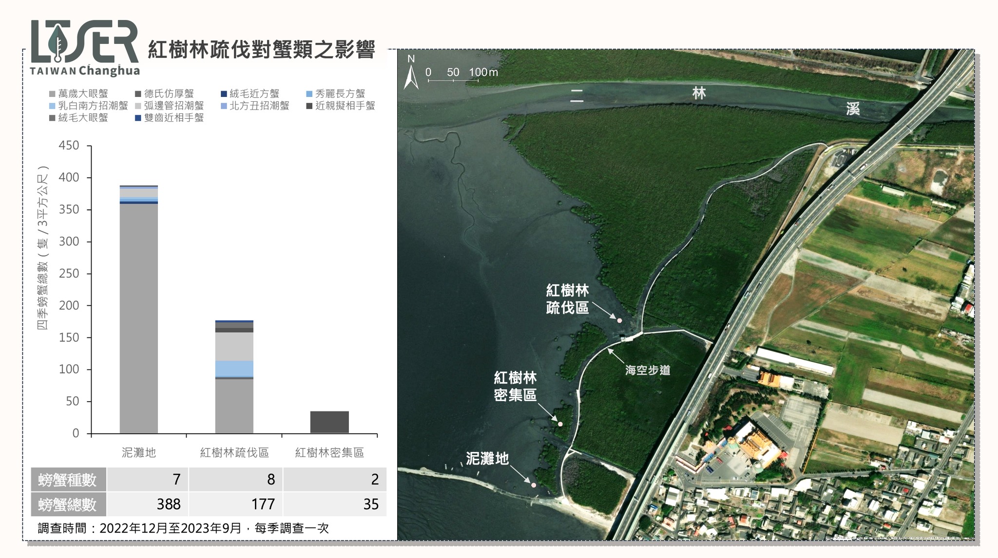施月英指出,根據臺灣長期社會生態核心觀測站(LTSER)彰化站研究,彰化芳苑泥灘地的紅樹林一處後,疏伐區的螃蟹種類和數量都明顯多於茂密區的紅樹林。