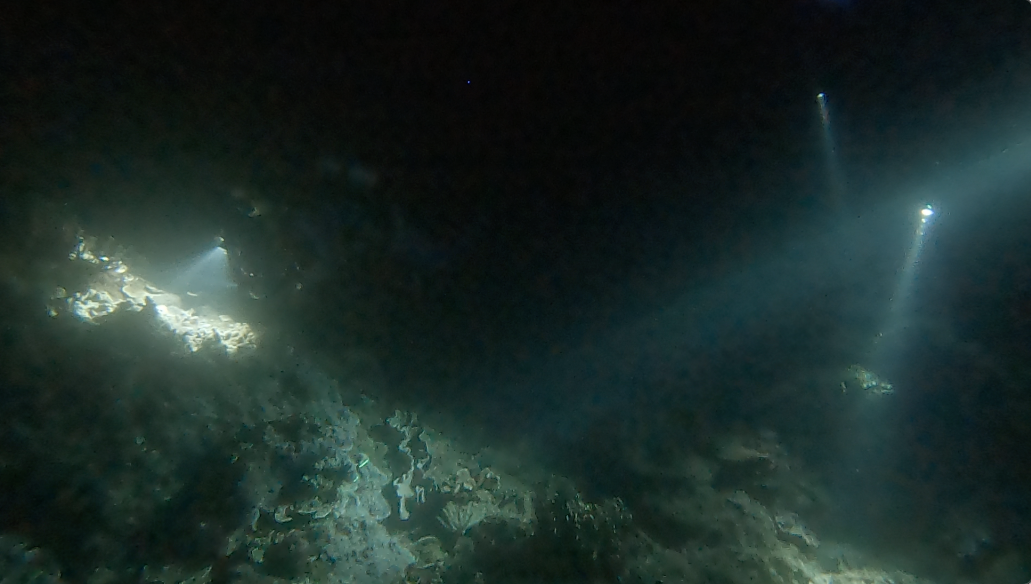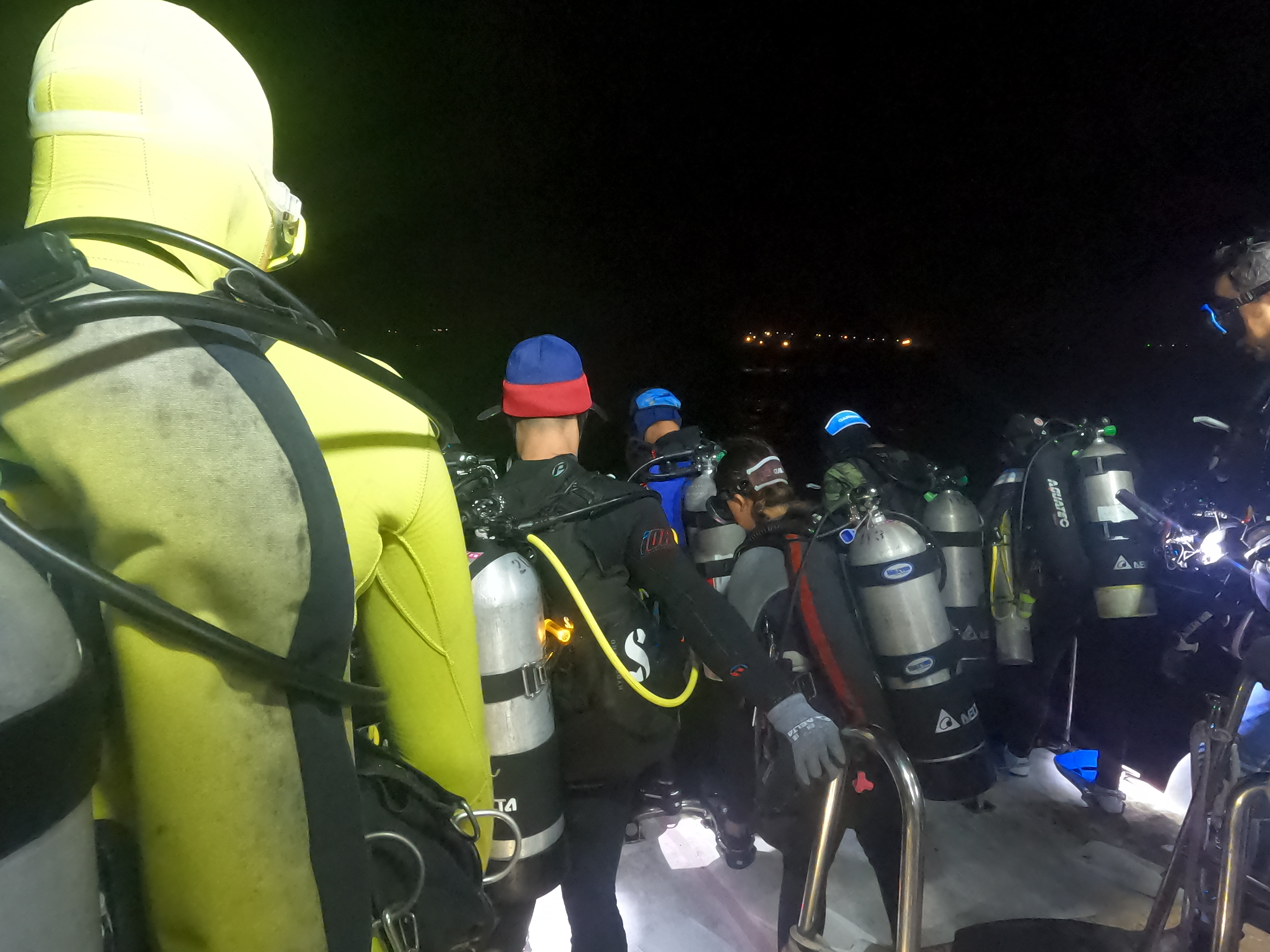 工作人員拿著手電筒、背上氣瓶,潛入漆黑的大海中,仔細尋找準備產卵的珊瑚。攝影/孫文臨