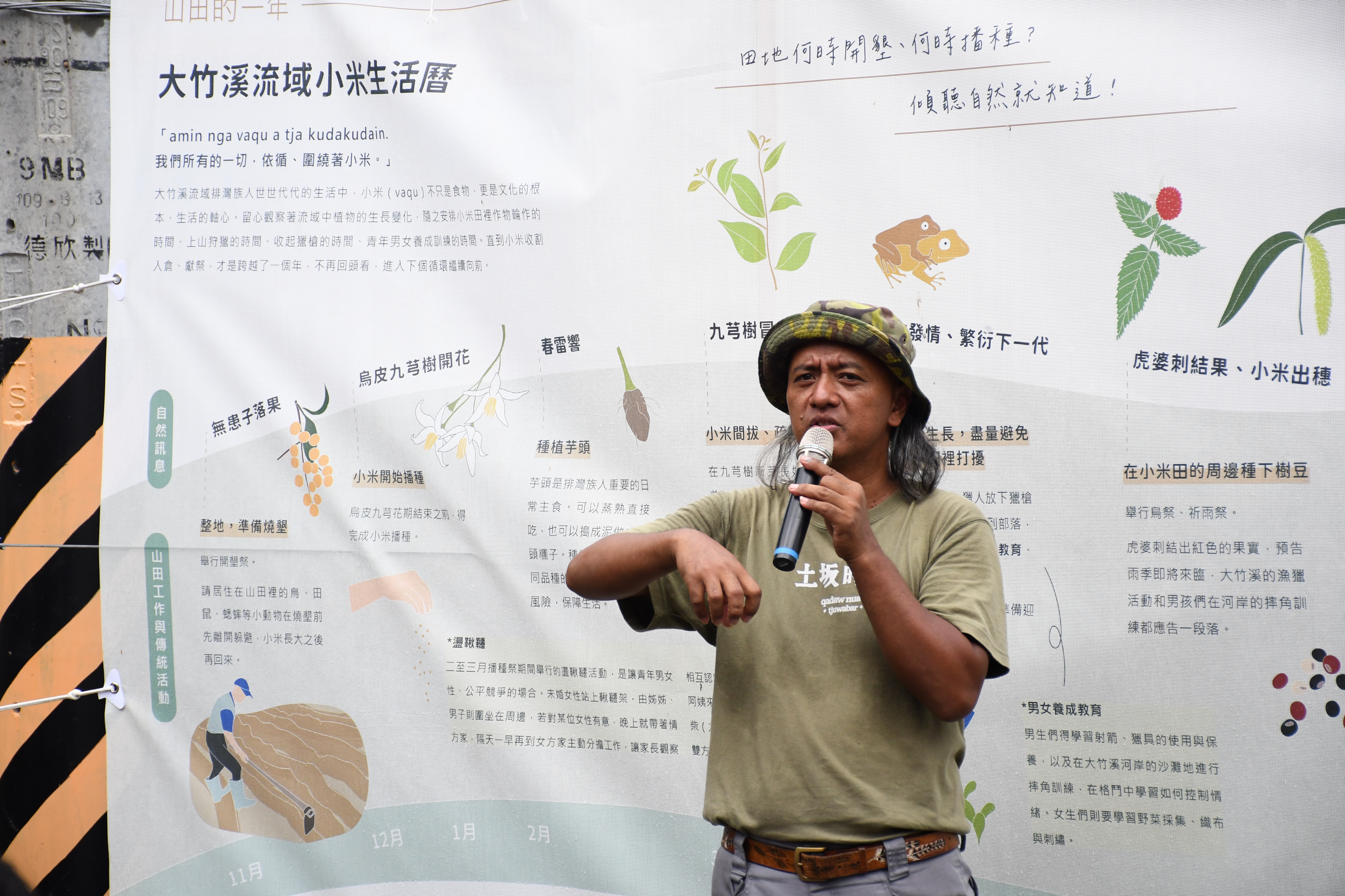 保種農民也會入校上課,讓孩子們了解小米與部落文化的關聯。藍保就是其中一位農民老師。藍保提到,對土坂部落的排灣族人來說,生活習慣及歲時祭儀都配合著小米農事和山林植物進行。例如無患子樹落果是開墾耕地的時間、烏皮九芎花期結束前小米要播種完畢、九芎樹冒出葉苞時小米得疏苗了……等等。
