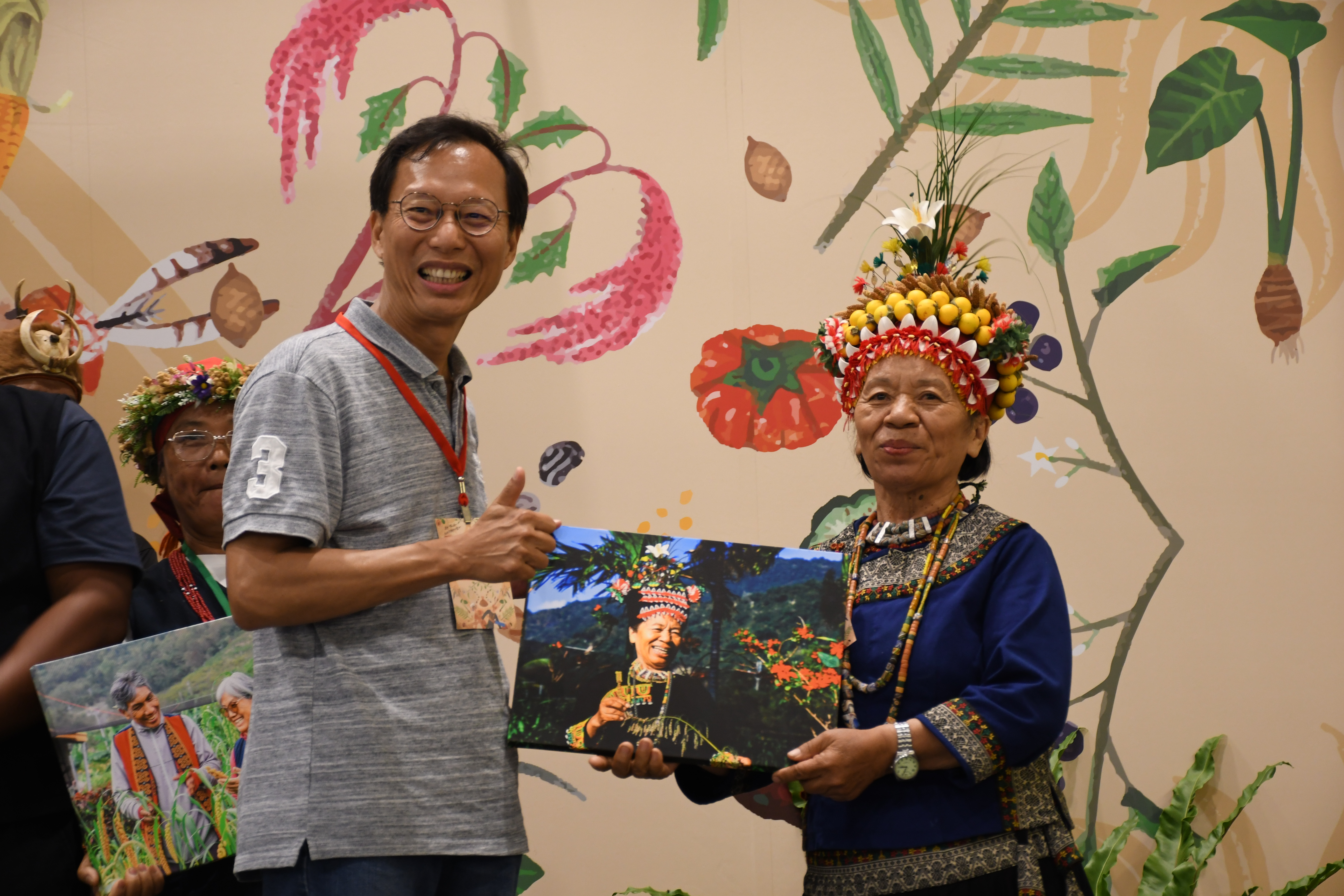 來自台東嘉蘭部落的歐春香(圖右)是公認的「保種大戶」,今年六月接受慈心基金會執行長蘇慕容(圖左)頒發保種農民表彰。攝影/邱怡瑄
