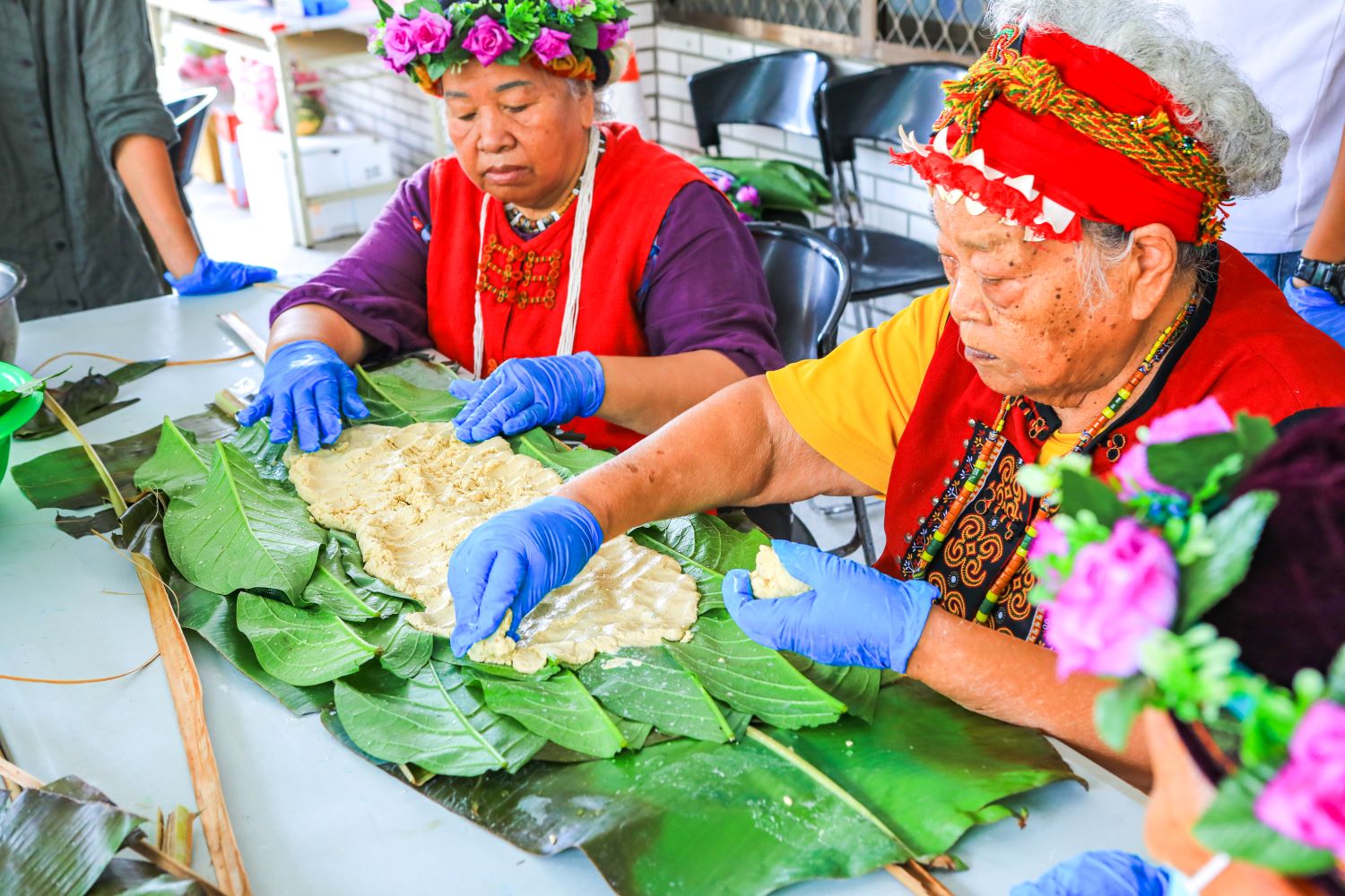 原民部落的文化健康站裡有許多資深小米達人。圖為文化健康站的耆老示範怎麼用小米包阿粨(A Bai)。圖片提供/慈心基金會