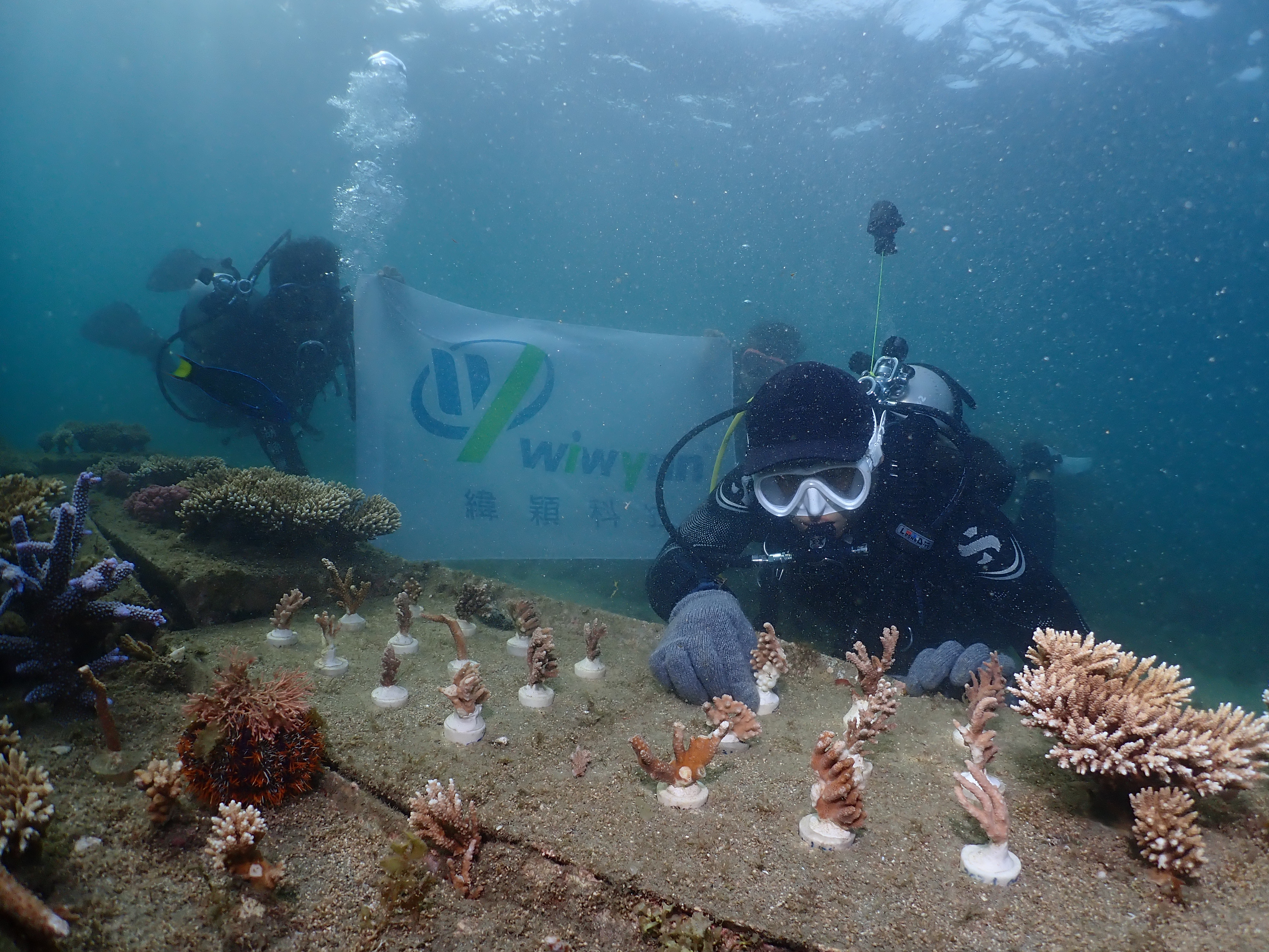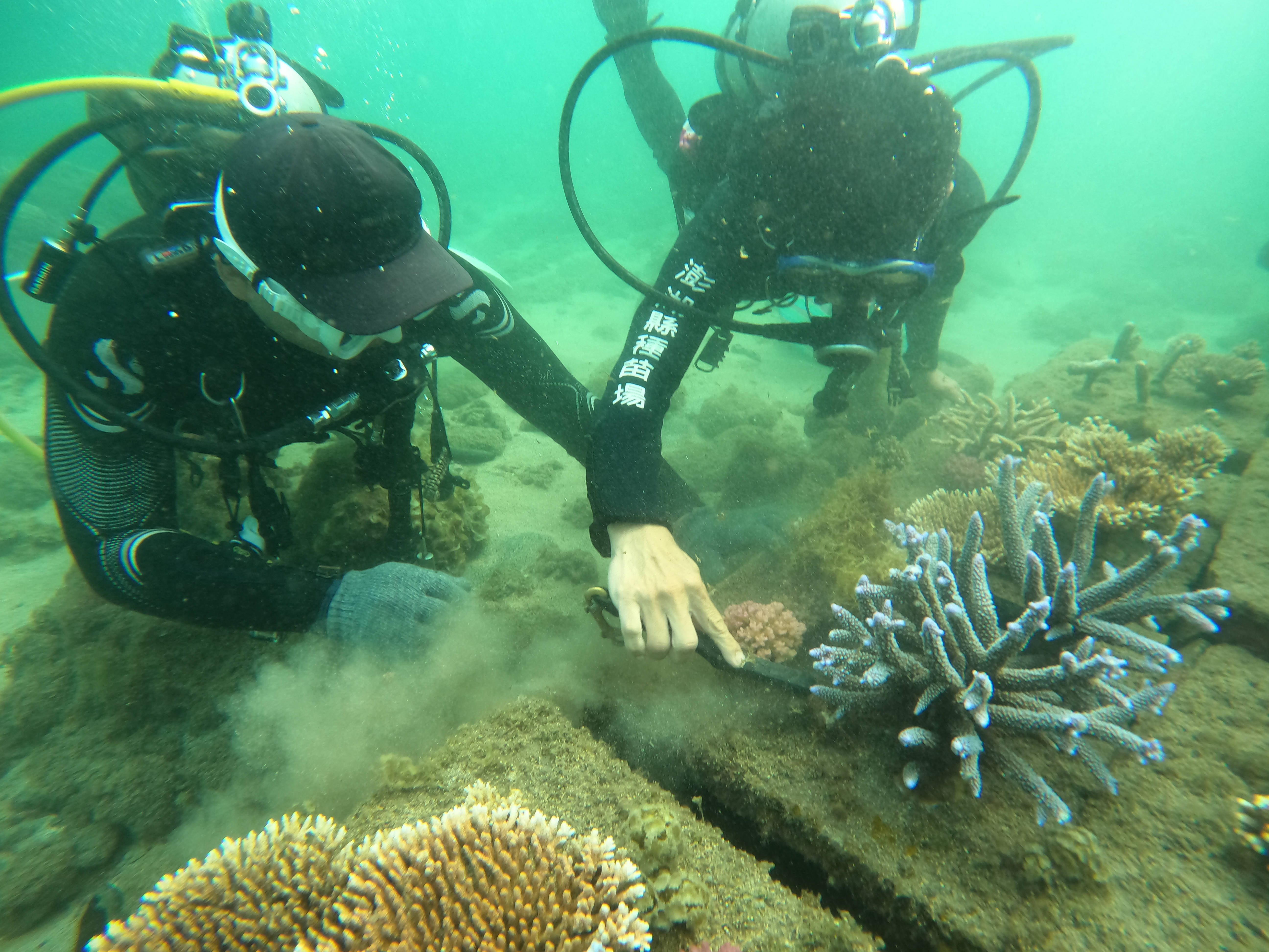 緯穎科技的潛水志工跟隨澎湖縣水產種苗場的工作人員,進行珊瑚復育工作。圖片來源/澎湖縣水產種苗場