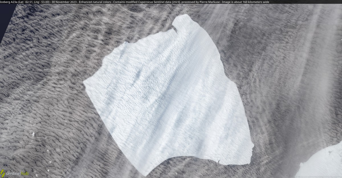 A23a巨型冰山漂流近40年,如今進入「死亡螺旋」,快速崩解成多塊浮冰,恐加劇航運風險。圖為2023年11月A23a的樣貌。圖片來源/Pierre Markuse flickr