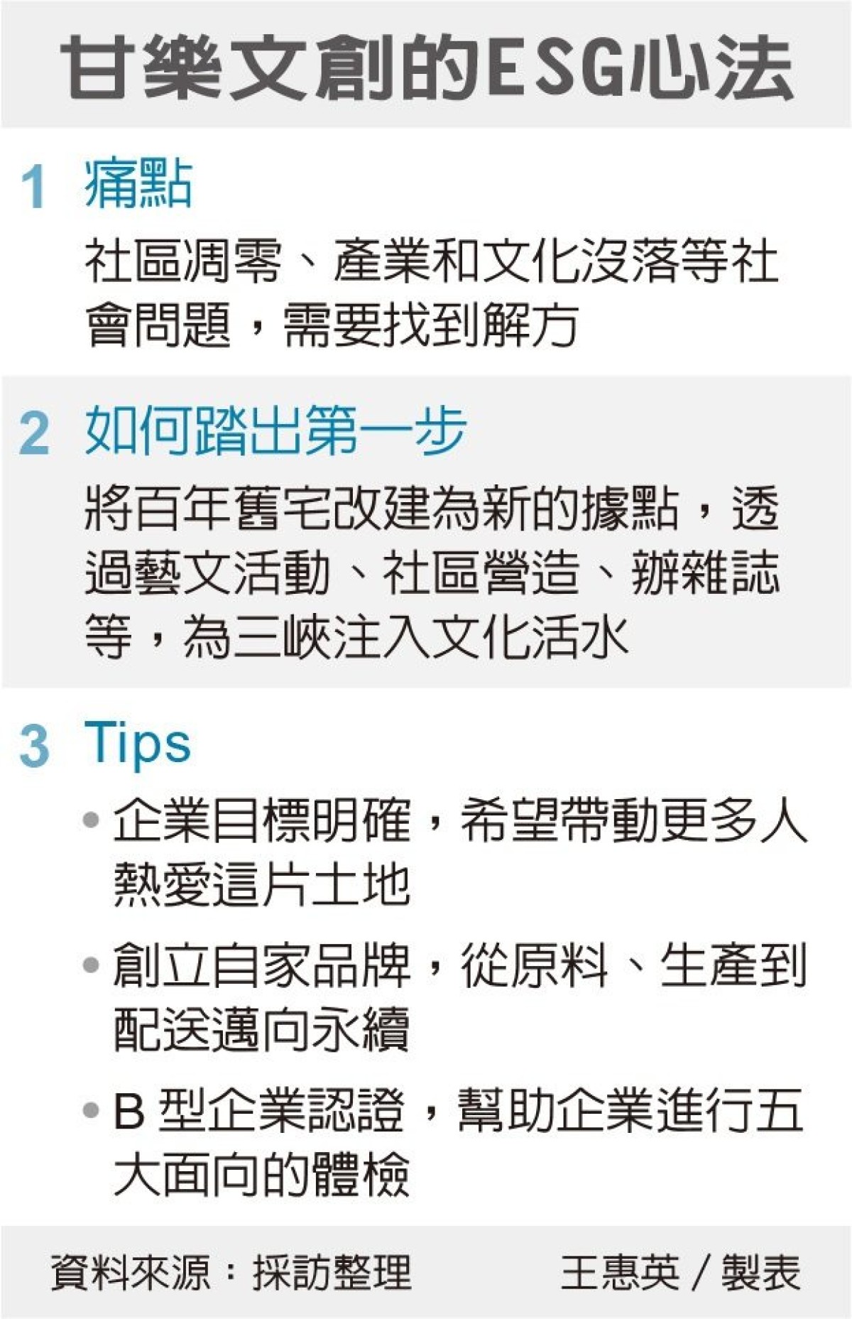 「我在2006年返鄉後,發現三峽的產業和文化沒人關注,孩子也不認識自己的家鄉。」甘樂文創執行長林峻丞回憶,從過去在電視圈深入各地報導,到決定在地創業,他的起心動念是「想要做點什麼」,希望讓社區再度被看見。