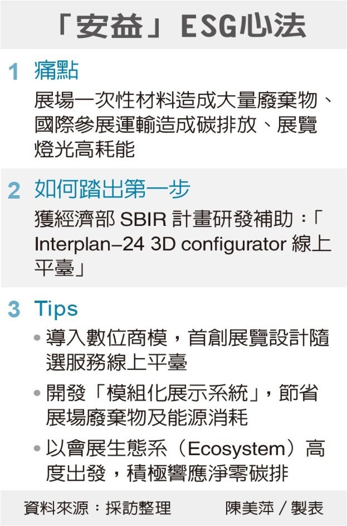 2022年,安益國際展覽與德國知名技術團隊聯手合作開發出「Interplan-24 3D configurator線上平台」,這是台灣首創的展覽設計隨選服務線上平台,目前上下游合作廠商已達34家,並與10家長期配合的協力商簽訂永續承諾書。2023年,這套隨選服務線上平台,還榮獲經濟部國際貿易署的「永續實踐獎」。