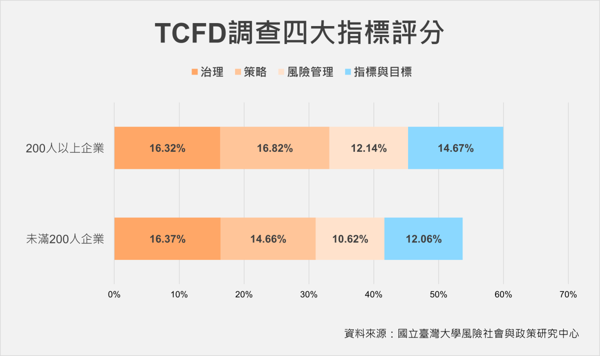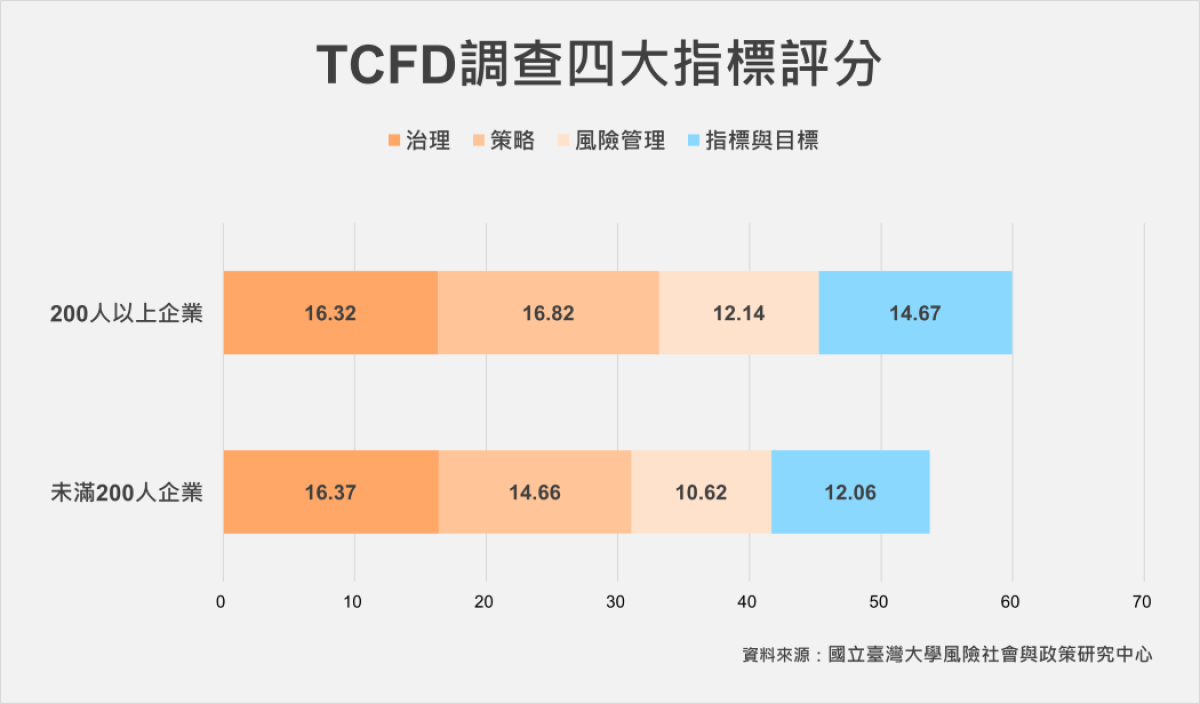 臺大風險社會與政策研究中心針對全台 906 家年營收超過一億元的企業進行TCFD(氣候相關財務揭露工作組)調查,包含治理(Governance)、策略(Strategy)、風險管理(Risk Management)以及指標與目標(Metrics and Targets)四大面向,評估企業在氣候變遷下的風險與機會。