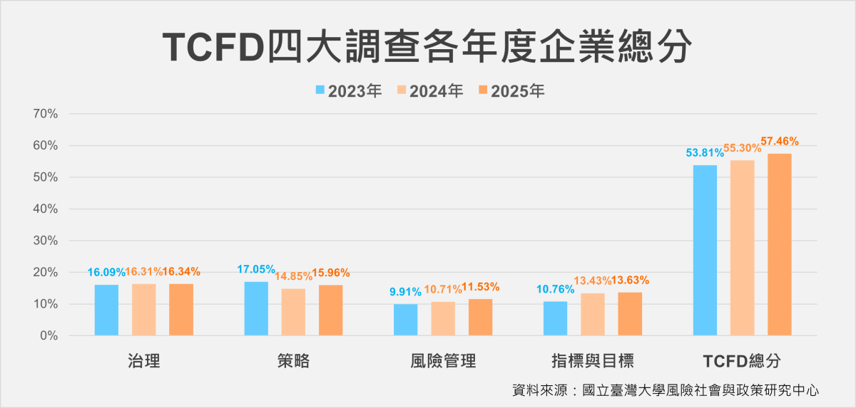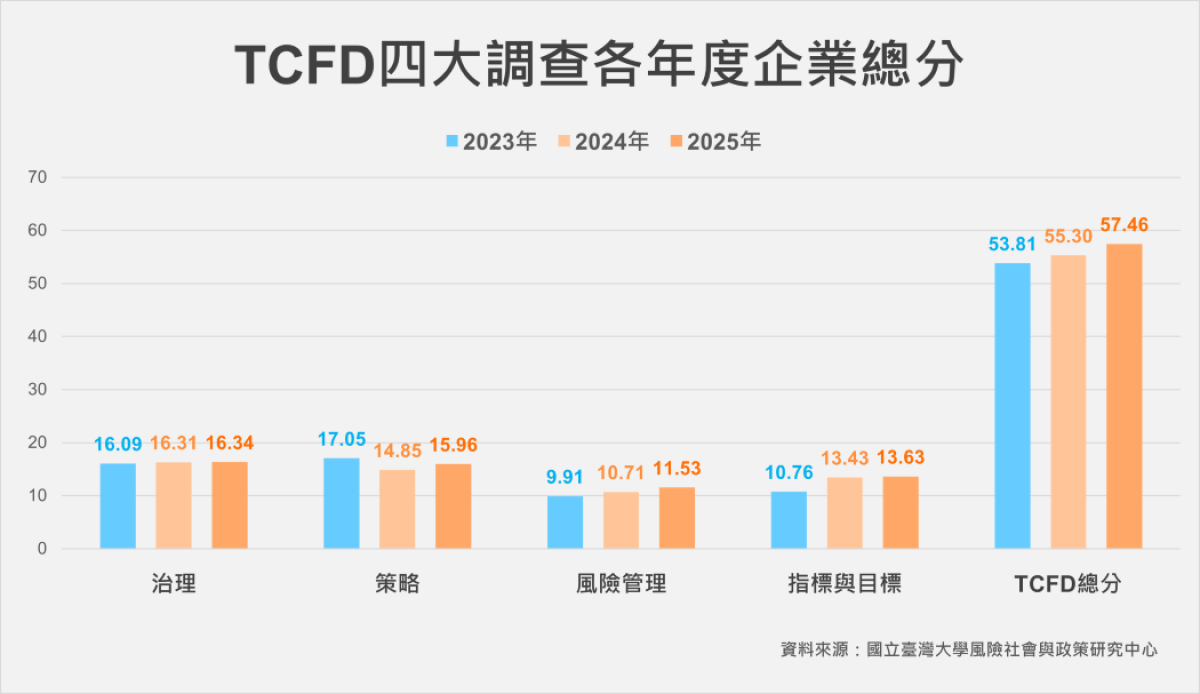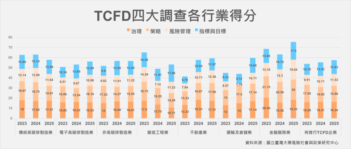 金融業、電子業、不動產業在國際壓力下加速前進;傳統製造業則落後,尤其在風險管理與具體目標上差距明顯。如果沒有妥善處理,可能讓台灣特定企業在永續轉型陷入困境。